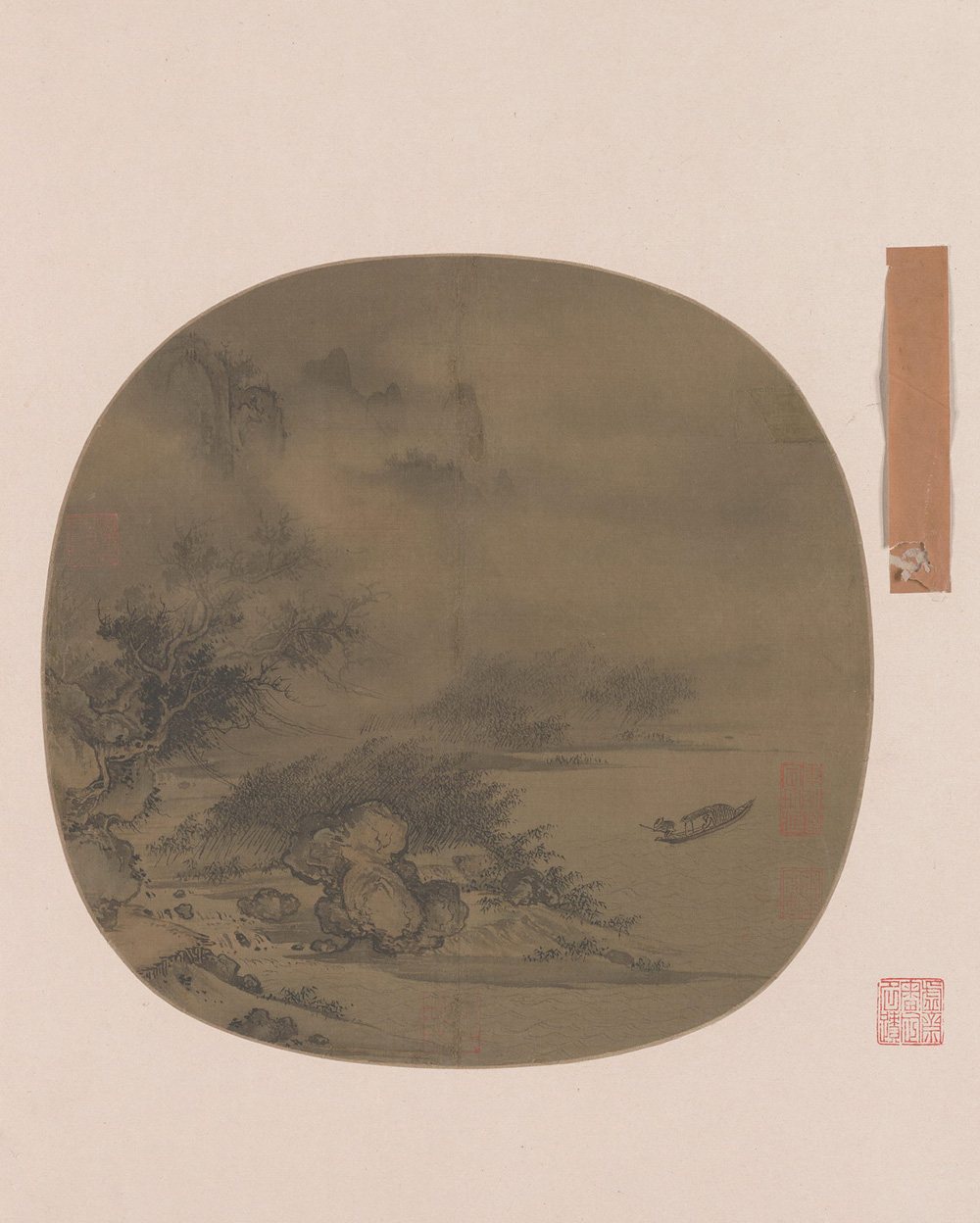图绘风雨交加中的江边景象,江面风生水起,波纹涟涟。一叶孤舟在风浪中颠簸前行,舱内一渡客抬头,遥望江岸,船头艄公身披蓑衣,埋头奋力撑篙前进。近岸芦苇、榭枝、藤蔓在疾风劲雨中大幅飘摇,与逆风而行的小舟遥相呼应。坡石用笔草草,烘托出风骤雨急之势。远处水天一色,云山悠远苍茫。全昼浓淡、疏密得宜,水墨韵致为典型的南宋风格。