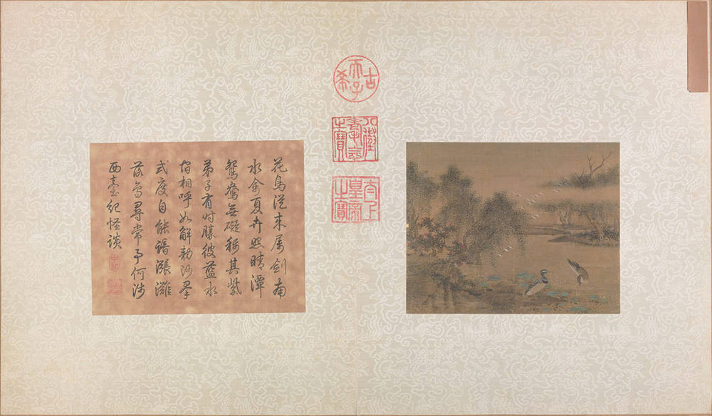对幅有清乾隆皇帝御题诗一首:“花鸟从来属剑南,水禽夏卉照晴潭。鸳鸯无碍称其紫,弟子有时胜彼蓝。水宿相呼如觧勅,沙群式度自能谙。涨滩落鸟寻常事,何涉西台纪怪谈。”