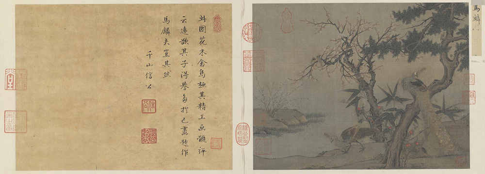 本幅无款识。钤鉴藏印“真赏”、“都尉耿信公书画之章”、“公”、“信公珍赏”、“丹诚”、“宜尔子孙”、“珍秘”、“会侯珍藏”、“庞莱臣珍藏宋元真迹”。裱边钤鉴藏印“信公监定珍藏”。本幅右侧题“马麟”细款,但细察周围有挖痕,应系从别处移来。对幅有耿昭忠题记:“此图花木禽鸟极其精工。《画髓》评云:‘远欲其子得誉,多于己画题作马麟。’夫岂其然?千山信公。”钤“虚斋珍赏”及耿氏藏印5方。