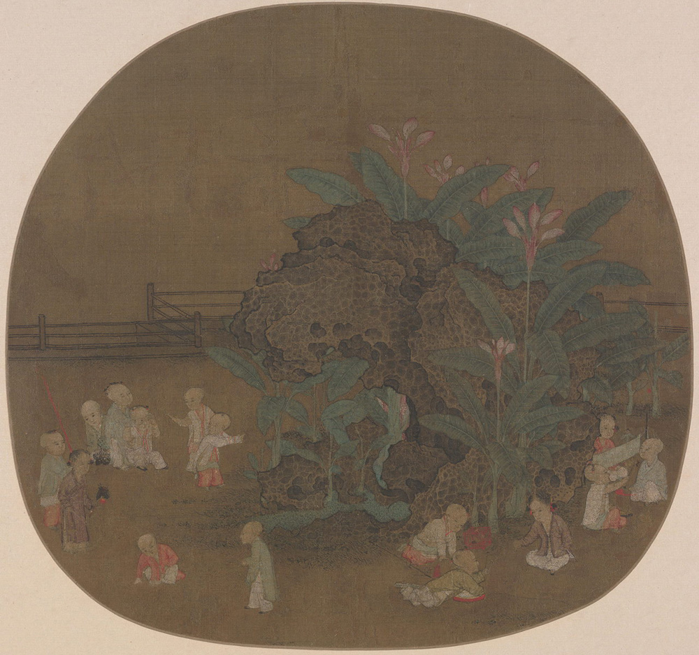 图绘湖石丛蕉,红花绿页,争奇斗艳。蕉石外围以曲栏,石前十五个儿童,姿态各异。有的展画观赏,有的嬉逗笼中昆虫,有的点鞭炮行乐,还有的玩捉迷藏。图中湖石千皴万染,玲珑剔透。芭蕉页用细笔勾描,花用没骨法。人物虽小,造型却准确有神。构图丰满,繁而不乱.