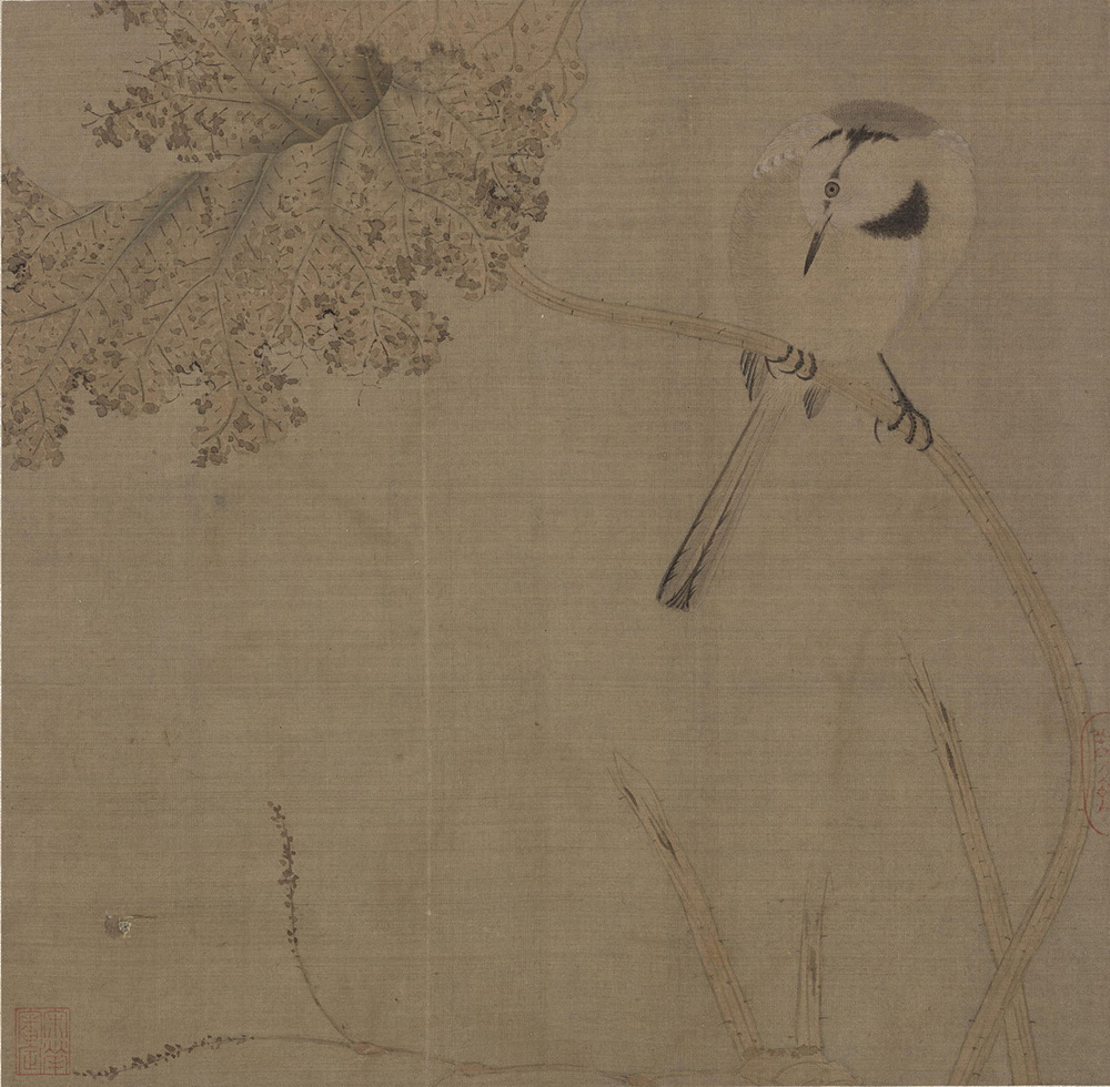图中荷塘里枯枝断茎,一片残败的荷叶向上斜出,翻卷的叶面,满布虫蚀的痕迹,一只鹡鸰停驻其上,双爪紧握荷茎,扭颈俯视,神情专注,为萧瑟的深秋平添了几许生气。鸟羽刻画细腻,先用色渲染,然后以极细之笔勾出,笔法生动秀逸。构图疏密有致,动静结合。