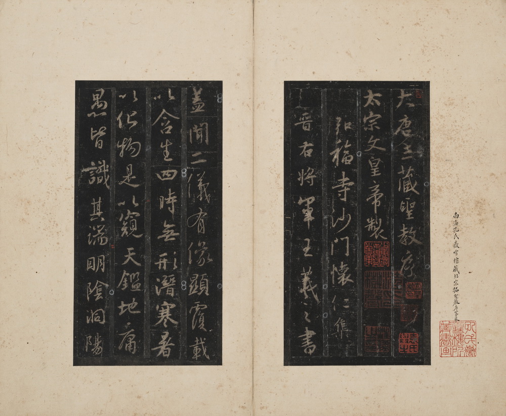 《集王羲之圣教序》历来被视为保存 “书圣” 王羲之行草书法度最重要的碑刻。文物馆所藏南宋拓未断本,墨色苍朴,字迹清晰,笔画饱满。曾经明代袁褧(尚之)收藏,有文徵明长子文彭观款,清代经姜宸英、孔尚任、查莹、孔广陶等递藏,又有李宗瀚、沈尹默等名家过眼题跋。