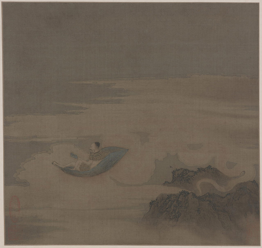 此图原载《烟云集会册》。图绘一仙人,身着草页上衣,赤脚露体坐于莲舟上,在天空中遨游观书。仙人呼风唤雨,来去如风的气质,刻画得恰到好处。作者又通过对漂浮不定、变幻莫测的彩云以及隐约的峰巅的描绘,更加烘托了仙境缥缈神秘的气氛。图中祥云纯用渲染法,山石勾点皴染兼用,但勾多点少。全图气势磅礴,构图新颖大胆,虚实结合,别出心裁。右下角有二字款不可辨,从墨色看,系后人添写。曾经《石渠宝笈续编》著录。