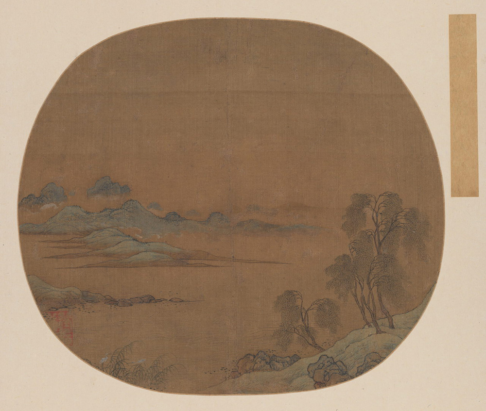 该图为纨扇面,图绘江山小景,近岸陂陀杨柳,中间留白以示江山,远山山势和缓连绵,云气缥缈。无款,左下存半印。