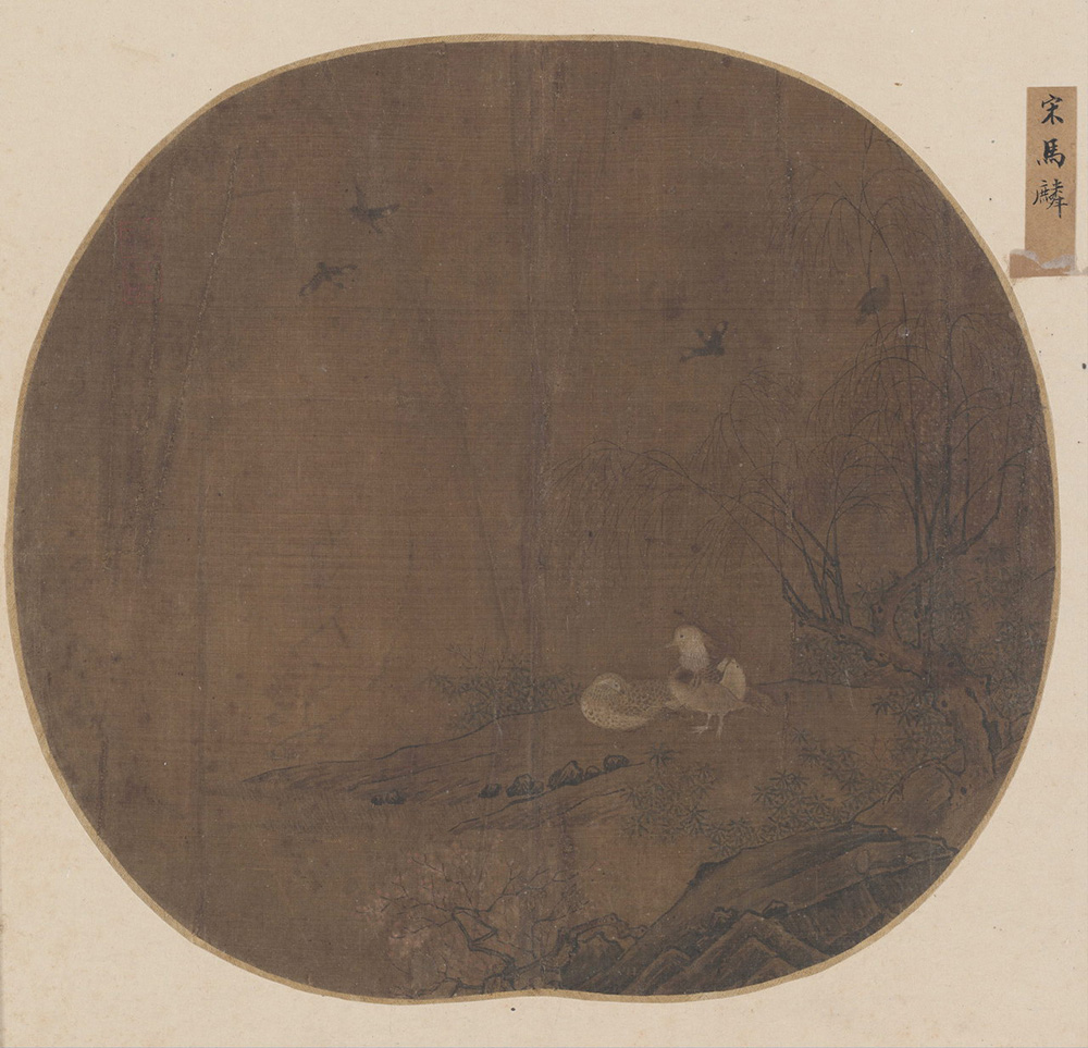 绘柳岸桃花,一对鸳鸯在水边棲栖,柳枝上有春鸟啼叫,一派春光。