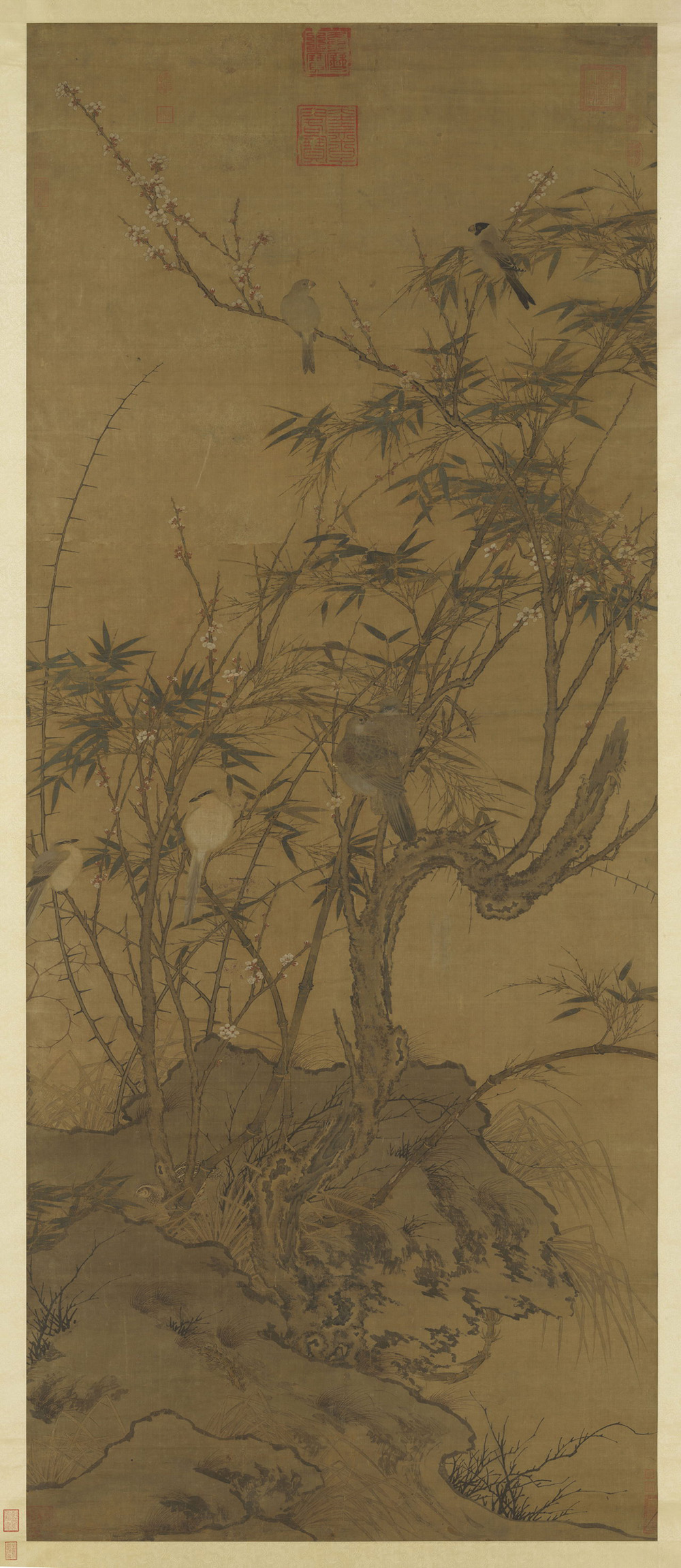 此画荒野陂石上,老梅著花,翠竹挺秀,棘草丛生,桑鸤、伯劳、绿鸠、鹌鹑栖息于其间。所作梅竹荆棘,枝干老劲,花叶秀润,各具生态。野禽翎毛尤有情趣,此乃缘于宋代为写生之极盛时期。而宋人作画讲究神理情趣兼到,故作品无论繁简大小,俱有天机活泼融和自然之致。画中构图稳定,枝干繁而不乱,弯曲的枝桠左来右往,不但形成富弹性与张力的线条,也给画面带来律动感。
