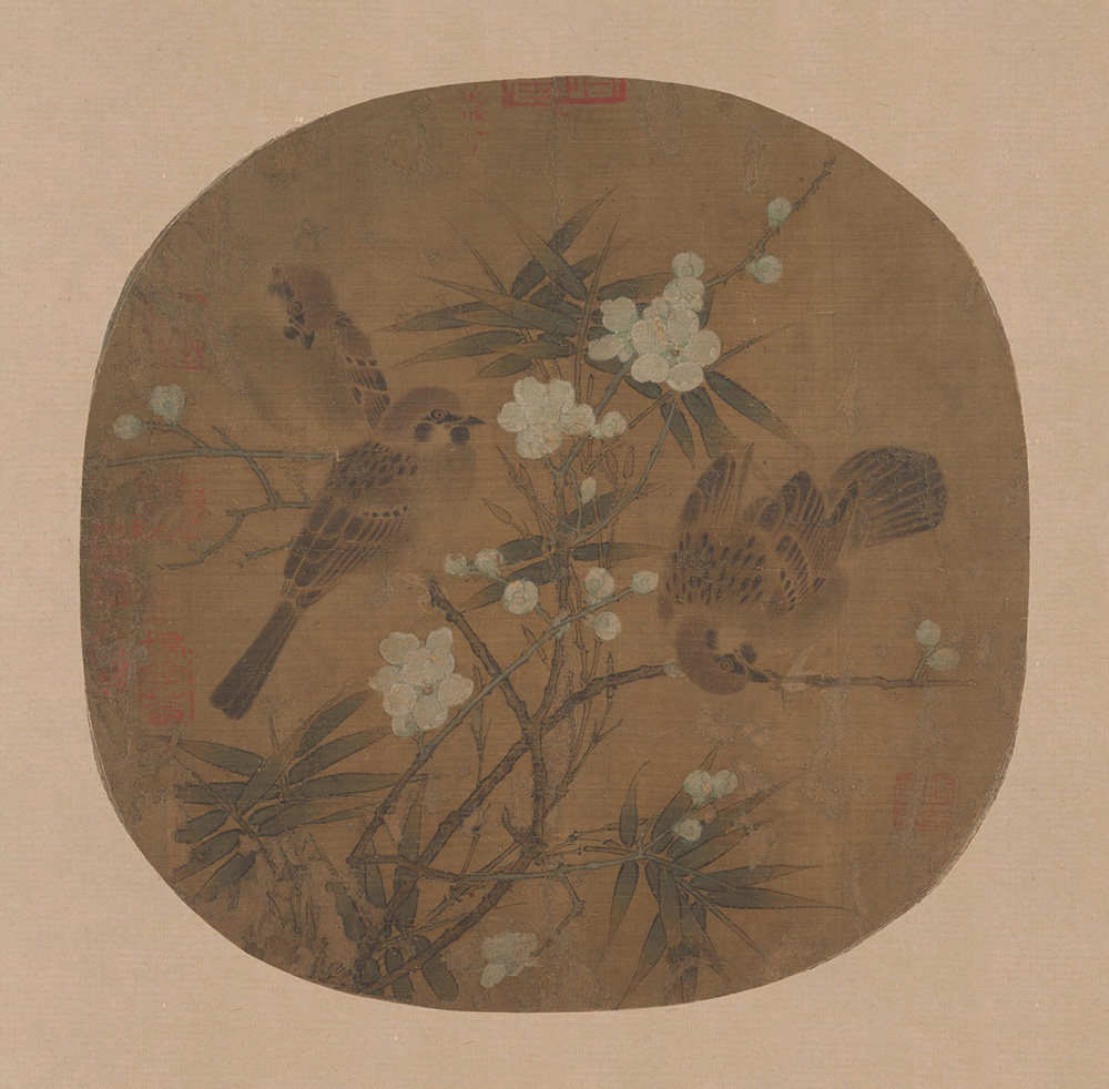 采用折枝画法,绘寒梅吐蕊、竹影摇拂、麻雀小憩之态,整体格调清俊雅致。画中梅花为梅中名品——绿萼梅,梅枝上栖有三只麻雀,姿态各异,笔法多变,栩栩如生。全图布局严谨,形象生动,属于同类题材中的上乘之作。