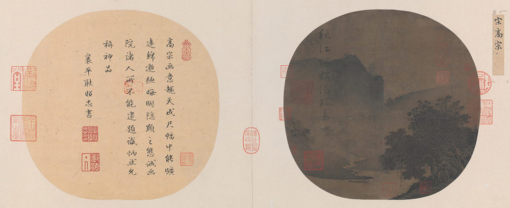 中近景,江中孤舟。远景,秋山下隐谧的寺庙。秋江烟瞑泊孤舟。今日秋分。宋高宗赵构题字。