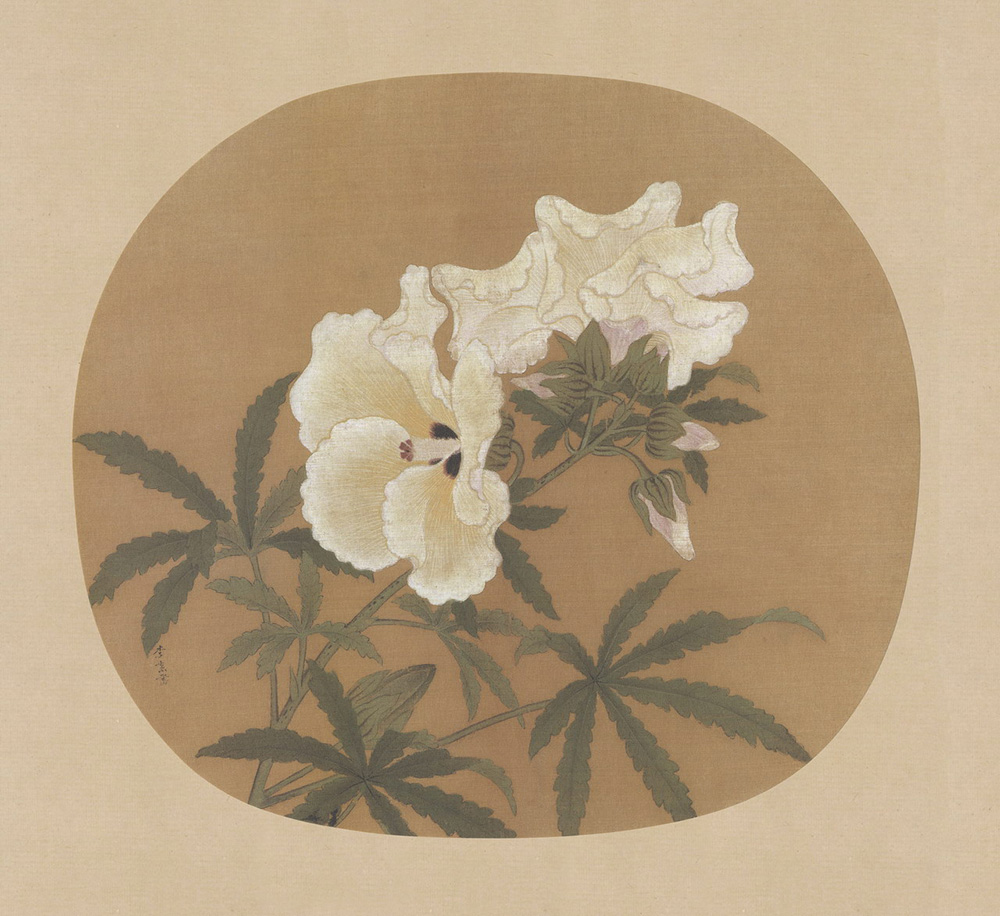 画面写秋葵一枝,工笔钩勒填彩。即先以线条勾轮廓,然后填以深重的色彩,其风格特点是用笔工稳精细,重在赋色。秋葵之花瓣用粉细勾,叶用重绿,重彩渲染,布局谨严,一丝不苟,姿韵生动。两朵盛开的花与疏疏的几枝叶,充分表现出秋葵的神态。此图堪称南宋院体画的精品,是南宋写生画的绝妙之作,据著名书画鉴定家张珩先生鉴别认为与马麟所画葵花团幅之笔法无异,故疑为马麟所作。