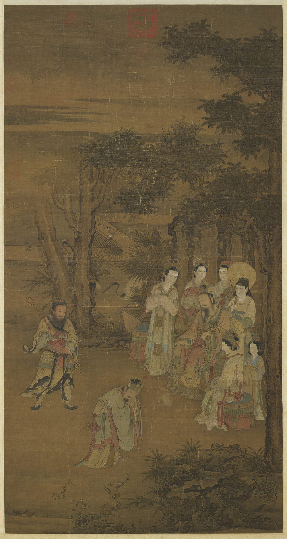 本幅绘汉文帝时袁盎谏止齐宠妃潜坐之故事。文帝游上林苑,甚夫人潜坐帝旁,袁盎面谏,谓帝既有后,不当容其妃同坐于侧,否则尊卑失序,终会祸及慎夫人。 帝纳其议,慎夫人亦赐金袁盎。画中坐花园一角,云雾掩映,树石包围间,袁盎正直言相谏,慎夫人怒,不愿就坐,文帝则端凝倾听,图像之表现亦在强调皇帝虚心纳谏的典范。幅上无名款,人物线条流利简洁,树石刻划精谨,为南宋院画佳作。