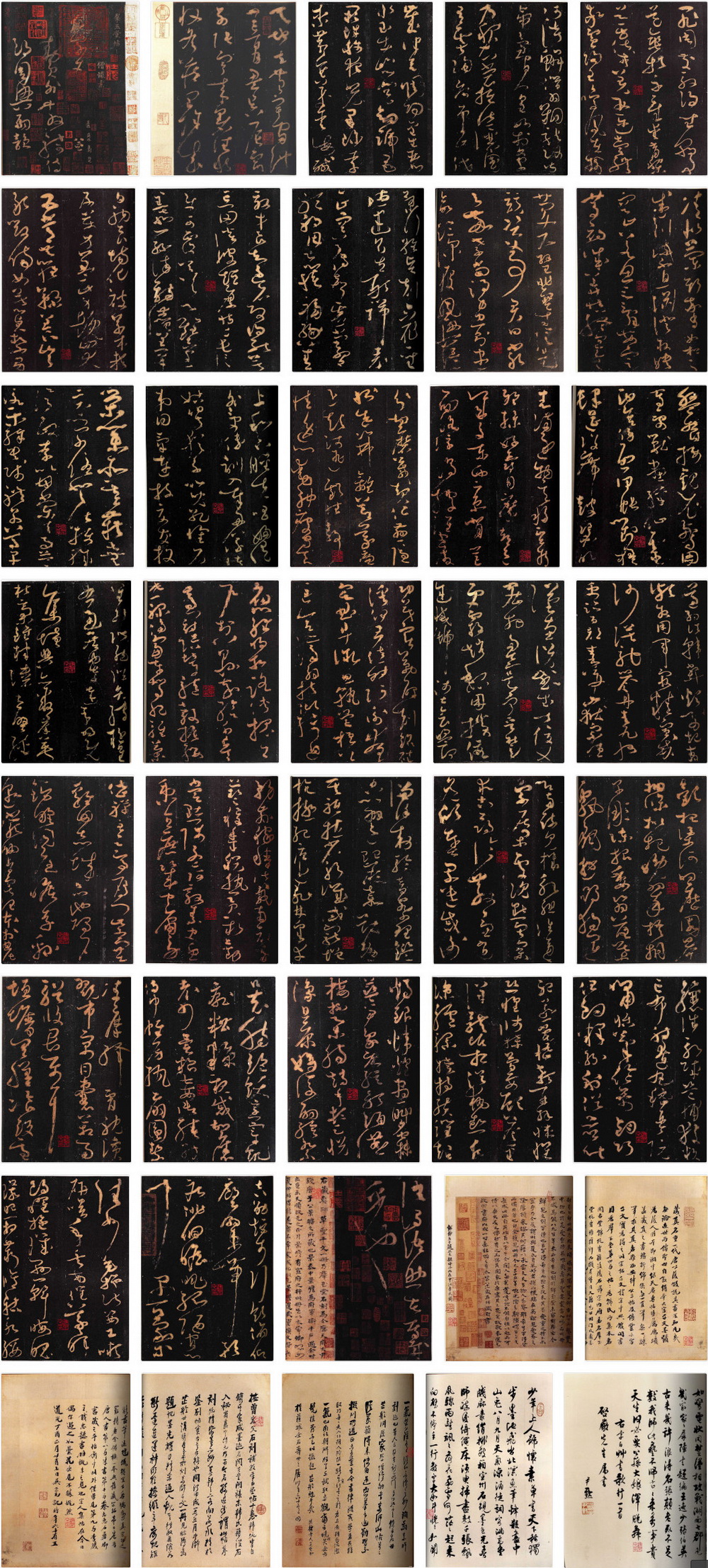 怀素《大草千字文》版本有三:绿天庵本、群玉堂本、西安本。此为《群玉堂帖》,共十卷,卷四为怀素《大草千字文》,为美国安思远收藏。《群玉堂帖》是他作品中很少见的精品。此帖原石早佚,拓本流传极少,明时已无全帙,残卷亦世所罕见。 均为重墨精拓,精彩逼人。
