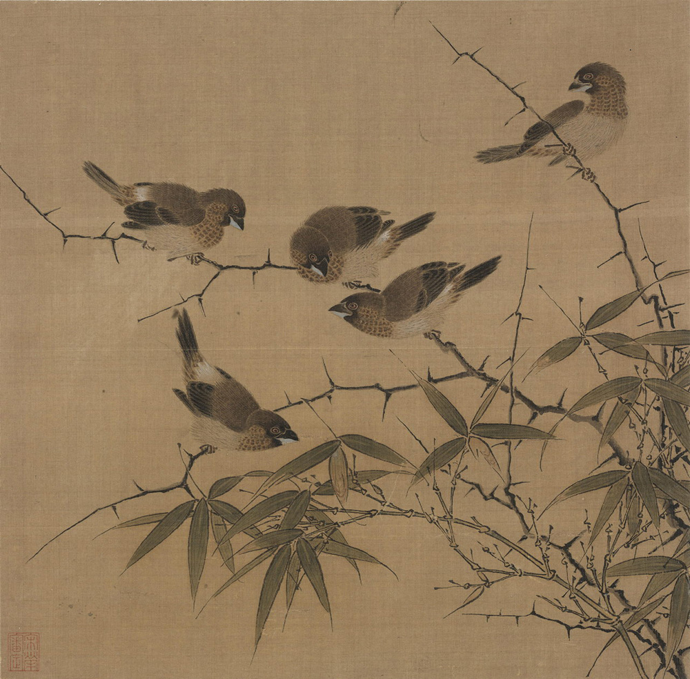 5只文鸟集于枯棘上,姿势各异,神态如生。枯棘下的竹枝色黄叶疏,点明了瑟瑟秋意。画家将聚集4只文鸟的重心着落于画面中心偏左的位置,而将另一文鸟绘于右侧高处的棘枝上以分散重心,但它回眸向下的眼神与另外4只相呼应,如此布局使画面既错落有致而重心突出。文鸟的描绘先勾出轮廓,再用细劲的笔锋绘出羽毛,并施以淡墨、赭石等色,渲染出毛绒的质感;竹叶使用双钩法,然后渲染;竹竿采用白描法;荆棘则一笔画出,显得苍劲老到。