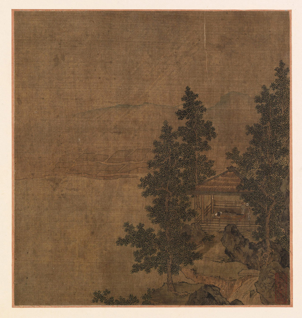 图绘古木掩映下一茅亭临江而筑,远处山色空蒙,中为平川水田。亭外巨石错落,泉水奔流。亭内置一方桌,一白衣长者袖手伫立桌前,仆人执扇侍立于侧。图中茅屋以界笔绘写,用笔严谨,远山以淡彩晕染,山石用小斧劈皴。构图简洁,景物层次分明。整图气格纤秀,笔法工细,为南渡后画风无疑。