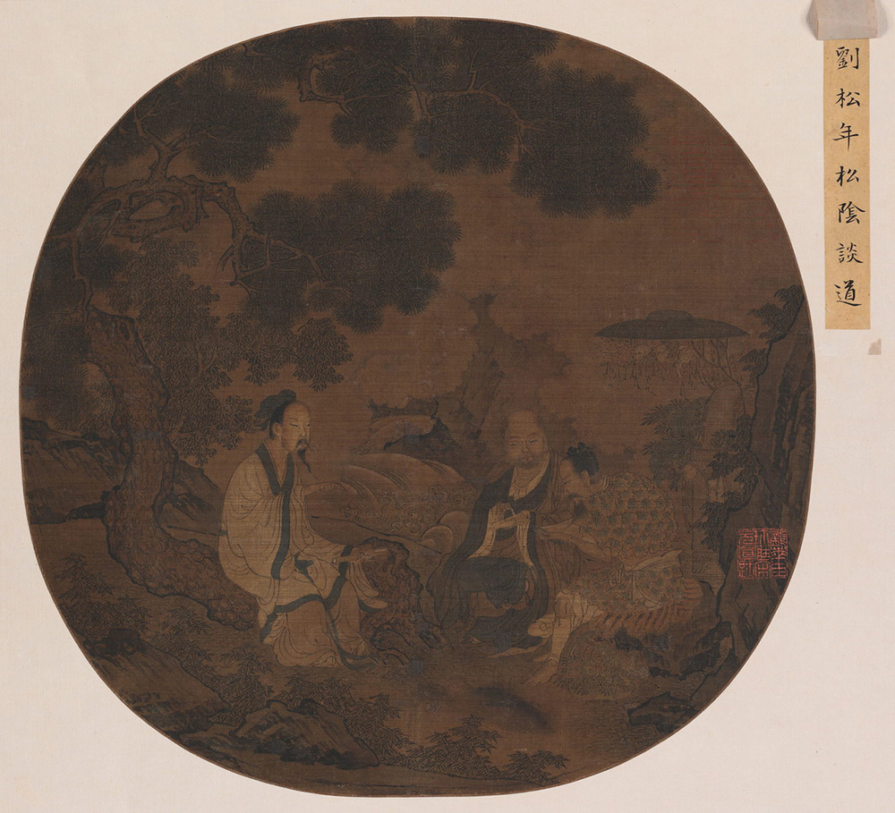 图绘远处山峰连绵,近处一棵高大松树松杆遒劲,绿荫如盖;松荫下儒、释、道三位教徒或着长袍,或着叶装,端坐于松根、石块上谈经论道。此处环境清幽,阴凉静雅,似世外桃园般安逸。