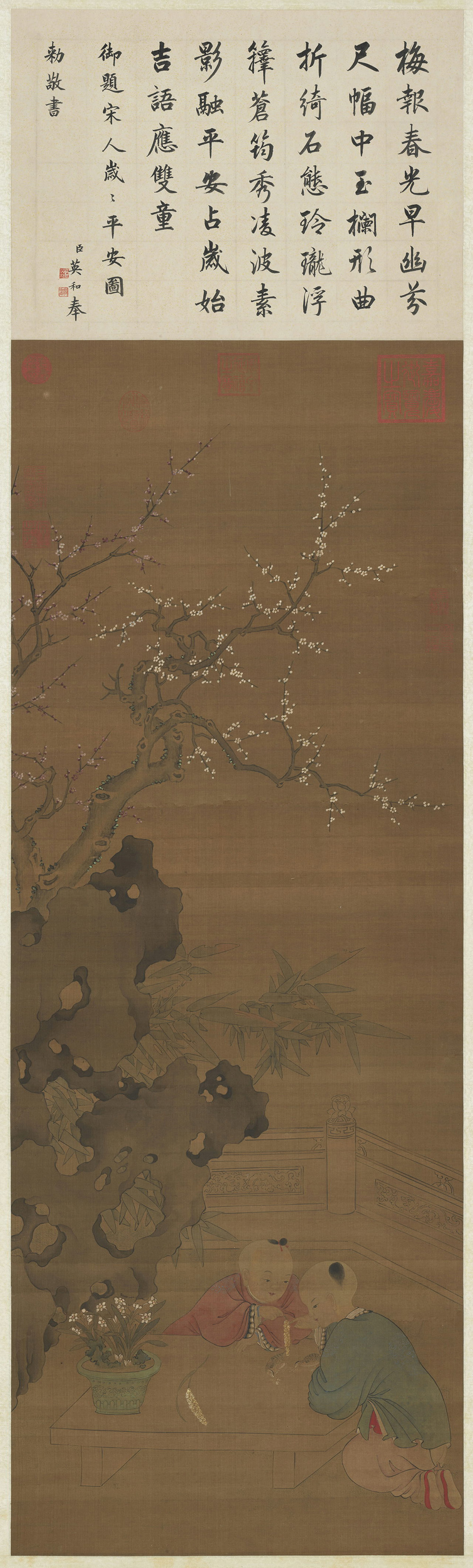 楷书:梅报春光早。幽芬尺幅中。玉栏形曲折。绮石态玲珑。浮箨苍筠秀。凌波素影融。平安占岁始。吉语应双童。御题宋人岁岁平安图。臣英和奉勅敬书。