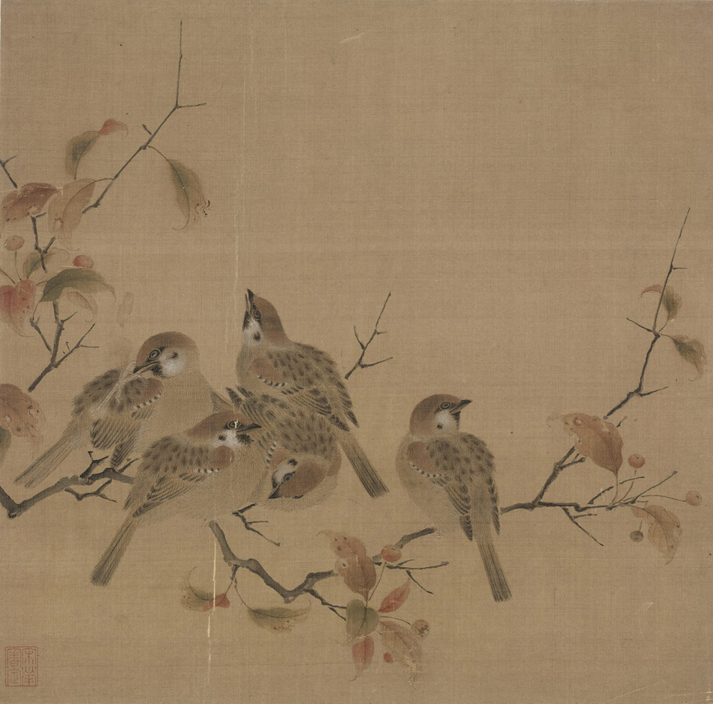 麻雀常宿于檐瓦之间,故一名“瓦雀”。图中从左向右伸出海棠一枝,果实散挂枝头,树叶已染秋霜,间杂红、黄、绿色,斑斓可爱,惜叶、果有些已遭虫蚀。海棠枝头栖息着瓦雀5只,其中4只或缩颈养神,或整理羽毛,姿势各异,神态安适,唯中间一只发现头顶树叶上落有小蜂,故昂首注目,张口欲啄,小蜂似发现险情,翘尾开牙,准备应对。此画面静中寓动,张弛有致,深合画理。