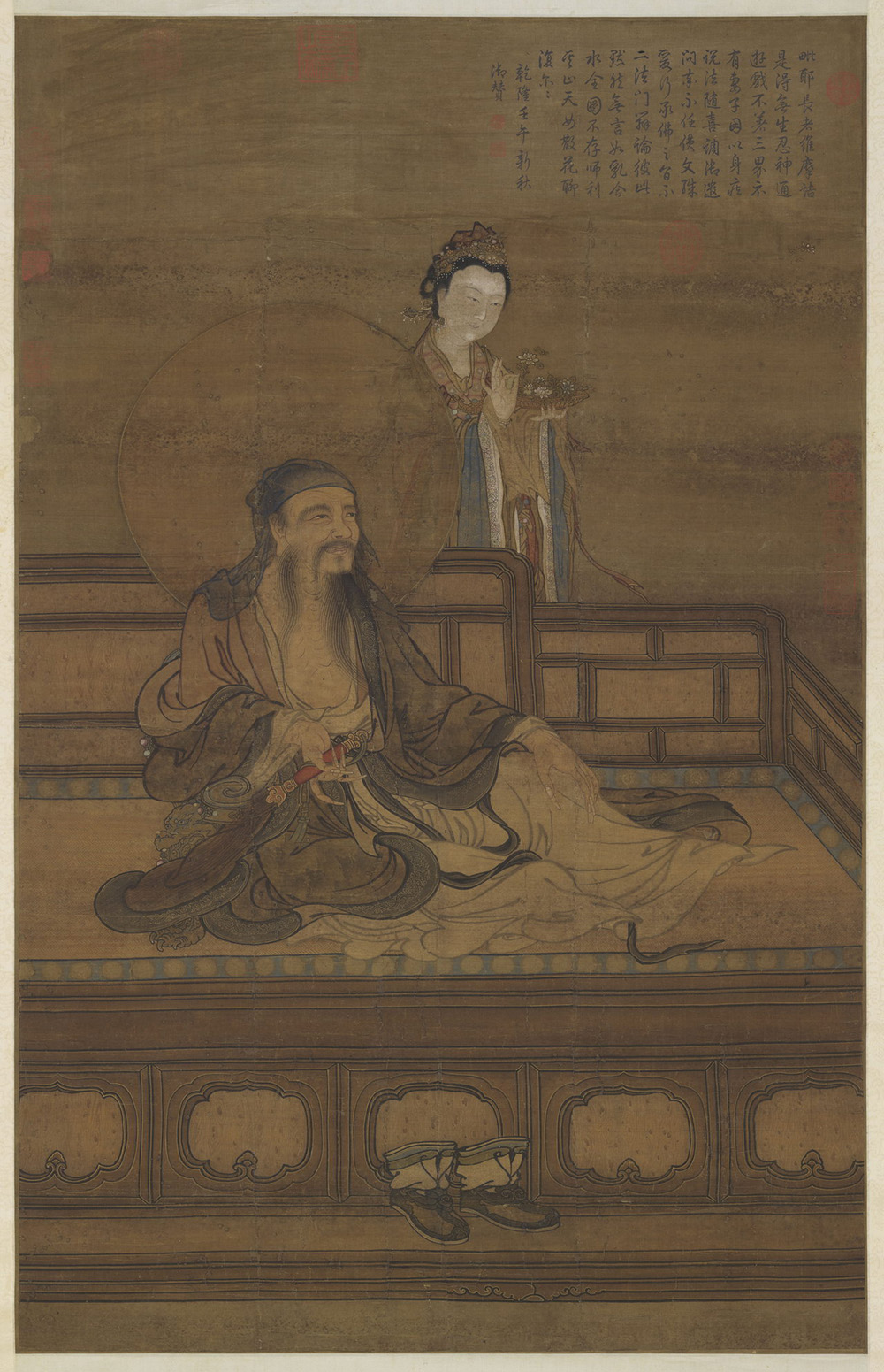此图独画大乘居士维摩诘坐于榻上,右手持麈尾,斜靠于狮形的凭几上,左手闲置于膝。脸部有胡须,坦露的胸部似乎显示出其身体的嬴弱,其身后站有一位手执花盆的天女。 本幅笔力劲挺,设色古厚。从风格观之,当是明代作品。