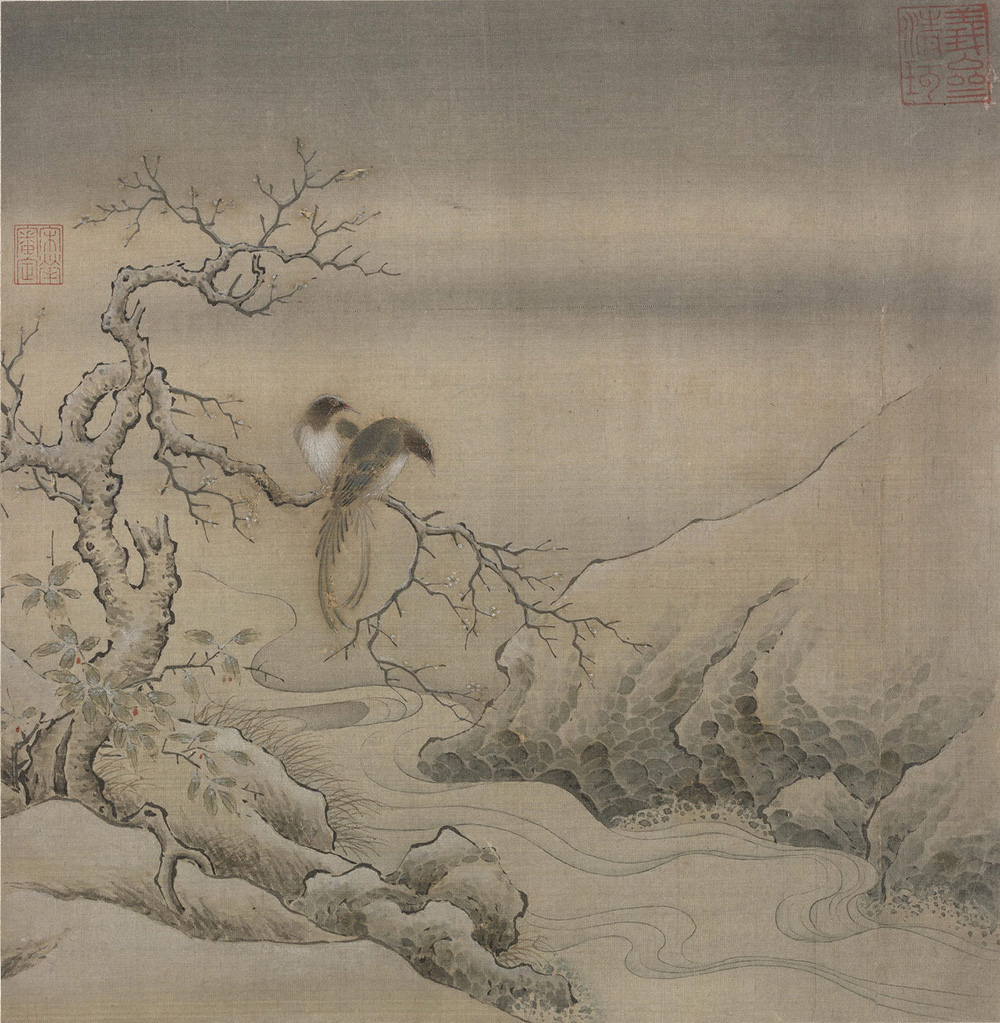 图写雪后溪边,天色晦冥,老梅初放。树栖绶带鸟一双,毛羽绚烂。自来图写文禽,多置之明媚春光中,此幅独以肃杀冬景反衬之,极具匠心。树下溪流湍急,水花飞溅,岸石上覆盖积雪。画家以水墨烘染阴天,以白粉表现积雪,以流畅的曲线描绘流水,皆具功力。最为独特的是为了表现溪岸岩石为水冲蚀而形成的蜂窝之状,另创皴法,前此未见。
