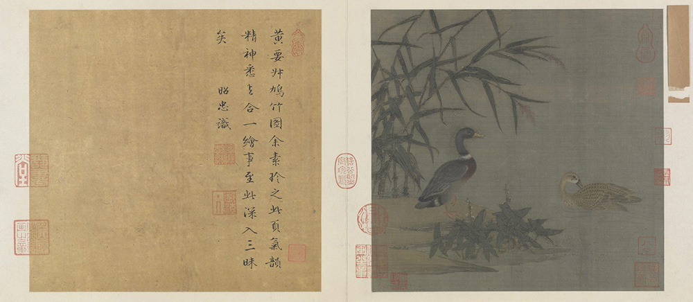图绘溪边芦苇、茨菰丛生,枝繁叶茂,生机勃勃。雄鸭在岸边单足站立小憩;雌鸭于水中回首梳羽,姿态闲适,气度雍容。此图意在表现一种祥和安定的气氛,应是南宋画院点缀升平之作。构图成熟简练,画面左中部为芦苇所荫蔽,给人安全之感;右上方则留出一片水面,启人遐思,以免闭塞。敷色精细写实,雄鸭毛羽的表现尤见功力。今色彩虽已暗旧,尚可想见当年斑斓生辉之状。