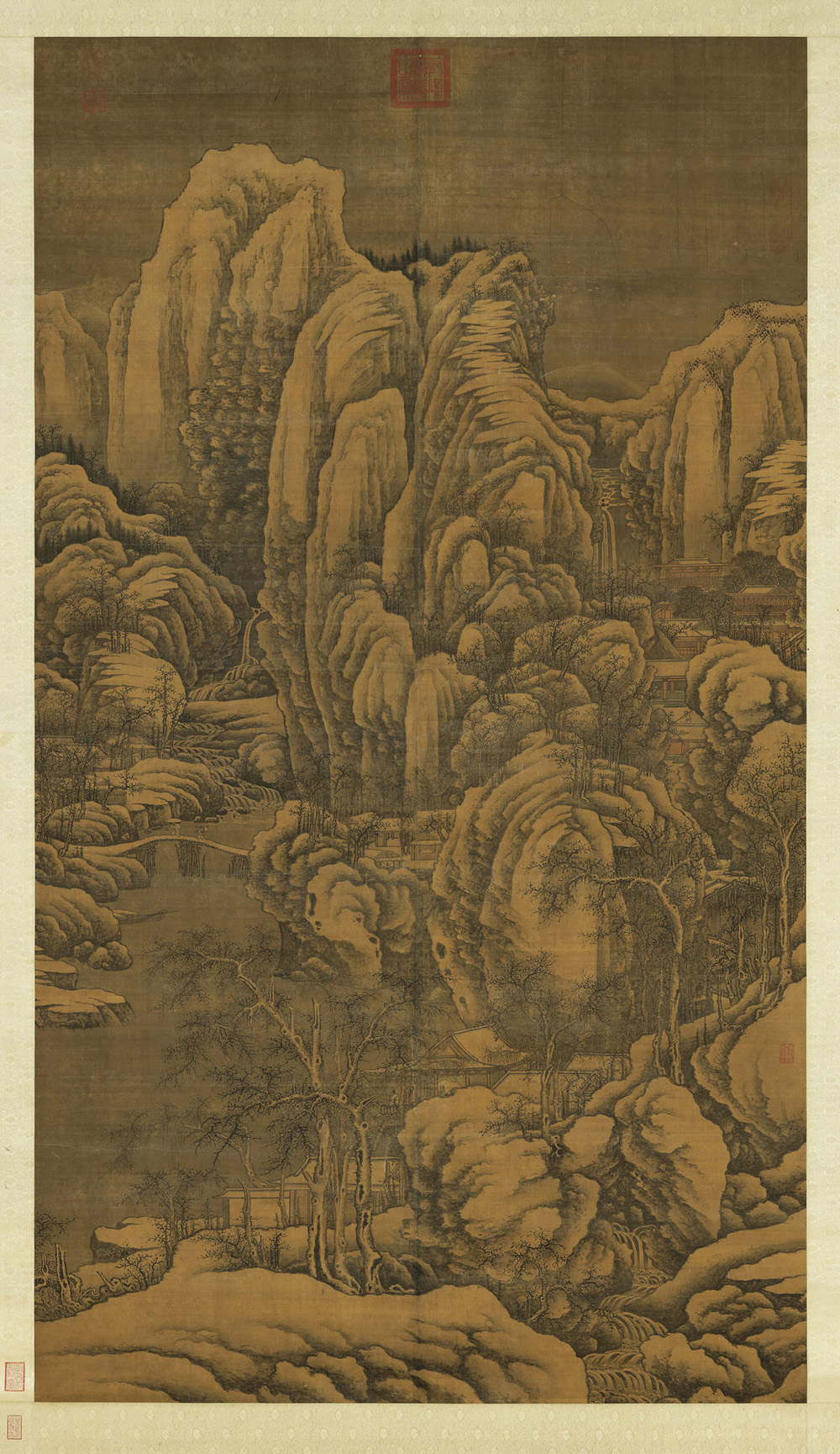 此图描绘初冬溪山雪景。山中寺庙游客赏雪,山间行人穿行。 与此幅面目相似的,世界各艺术博物馆有五、六幅之多,弗利尔美术馆所藏传郭熙《雪山兰若寺图》与此幅几乎一样,或互为摹本。
