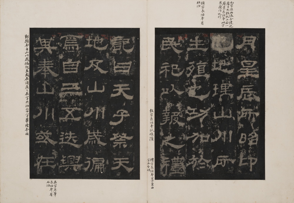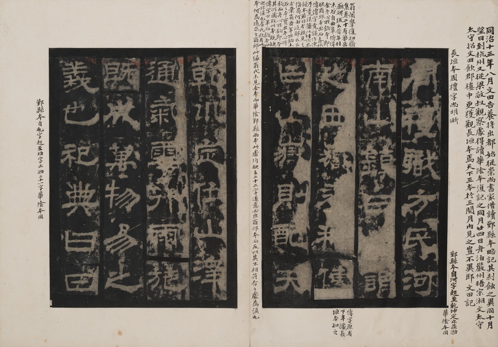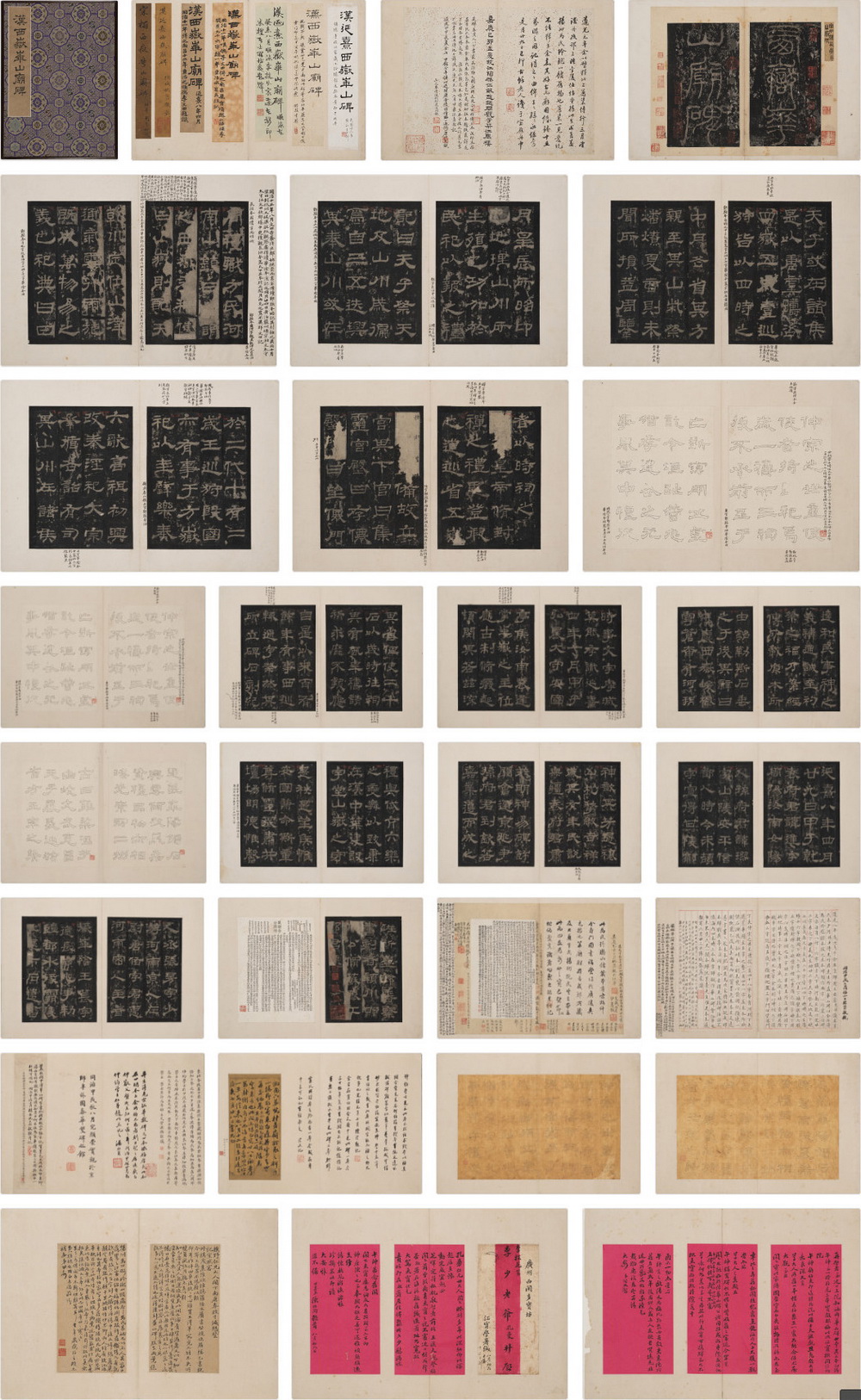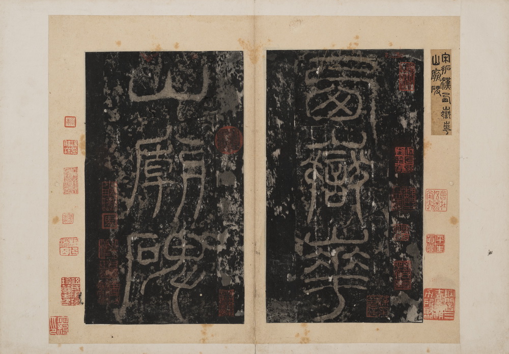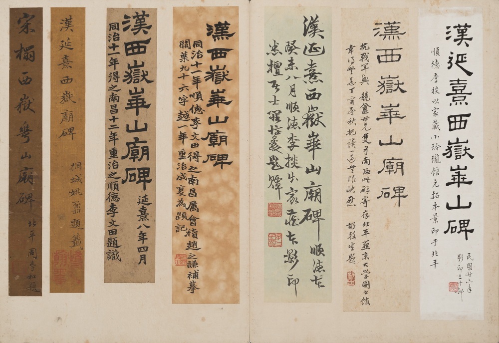 此拓原碑立于东汉桓帝延熹八年(165)于陕西省华阴县西岳庙内。原碑因明代嘉靖年间关中大地震及两度维修西岳庙而失佚。《华山庙碑》结字紧密,清初著名学者朱彝尊激赏此碑集方整、流丽、奇古于一身,被视为汉代隶书的顶峰,是 “汉隶第一品”。原碑于十六世纪中期损毁,令原拓更显珍贵。此本经金农、张敦仁、孙星衍等递藏,当中题跋甚多,包括姚鼐、伊秉绶、严可均、顾广圻、龚自珍、潘祖荫、王懿荣等名家,还特附赵之谦双钩补摹手迹,将所缺两页补齐。