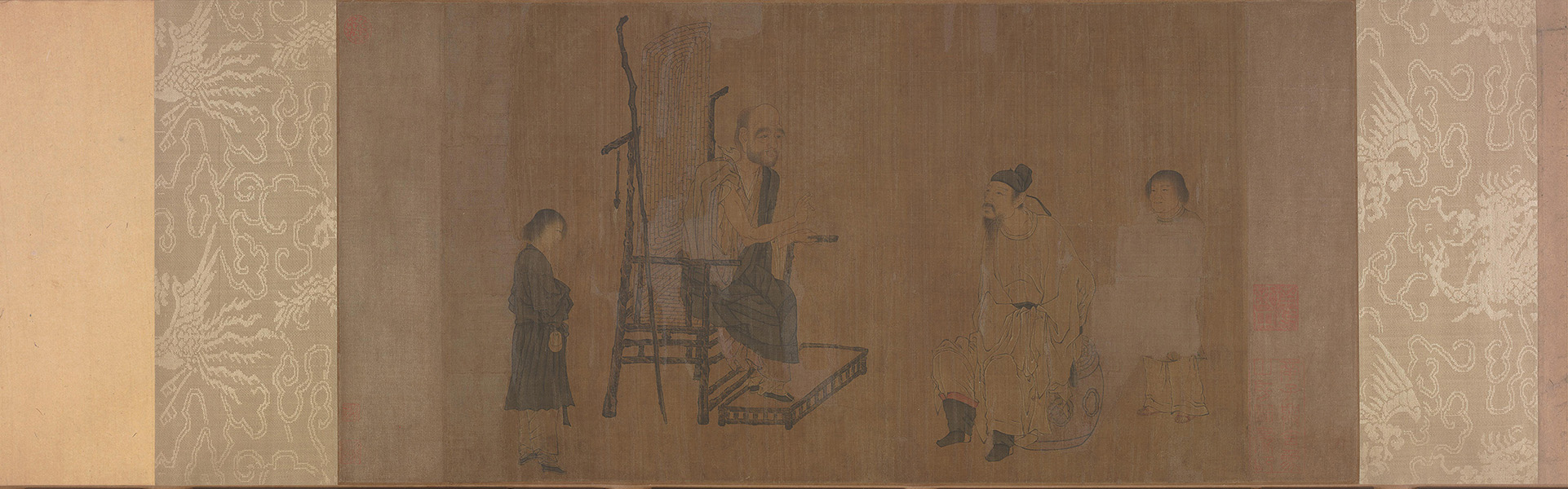 该图绘四人,左为一僧端正地坐于一竹篾坐垫、靠背的椅上,面部的笑容、捋起的衣袖及右手前伸的动态,表明他正在兴致高昂的谈论某事,较为端正的身姿似又暗示了他一贯的谨慎和克制。图右绘一中年书生和僧人相对坐于鼓形凳上,面容清瘦,专注的表情和身体前倾的动态,表明了他对僧人谈话的极力迎合。中年僧人、书生身后各有一童子相随。在人物动态和艺术风格上,该本和辽博本较为接近,但省略了僧人身后仆从烹茶的情形,另在僧人坐姿、仆从及器物等上与辽博本也有不同之处。