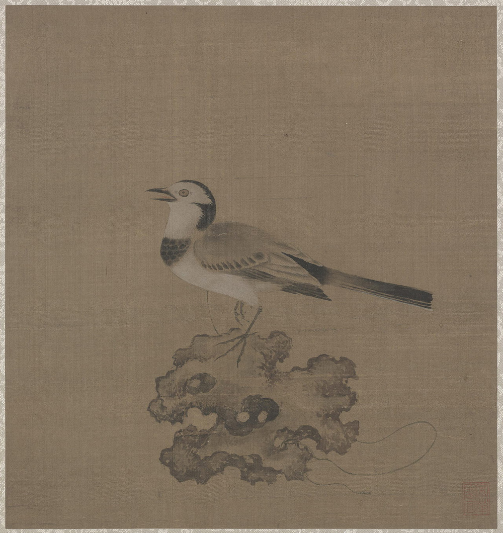 图中画一只美丽的山鸟,单足立于太湖石上,神情凄楚,啼鸣不止,右爪不安地刨动。细观乃知其被一细绳系于石上,失去自由。作者用心至为深婉。宋欧阳修有句云:“始知锁向金笼听,不及林间自在啼”,亦即此意。本幅无款识。钤鉴藏印“宋犖审定”。裱边题签:“宋人画绣羽鸣春”。