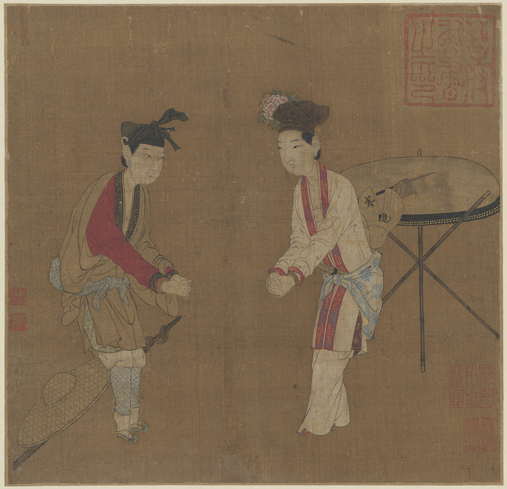 无款,此图亦散册。图中二角色皆为女子所扮演。右方一人,背后插一扇,上书末色。其扇中裂为二,与前幅「眼药酸」副末色所用之扇同,疑为副末色专用之道具,用以点明角色者。惟一则用「诨」字暗示,此则明书末色耳。腰间所插之物,亦即剧终时用以扑净之篦。至其剧名,周贻白先生疑为「鞭帽六么」而未能作肯定。按《萝粱录》于记杂剧后又称「又有杂扮,或曰杂班,又名经元子,又谓之拨和,即杂及之后散段也。」此图或是杂剧后之散段亦未可知,录以待考。图中人物衣纹细劲流利,神情动态刻画恰到好处,为杂剧史珍贵形象资料。画中钤有「晋府书画之印」等印五方,经元内府收藏,不见著录。