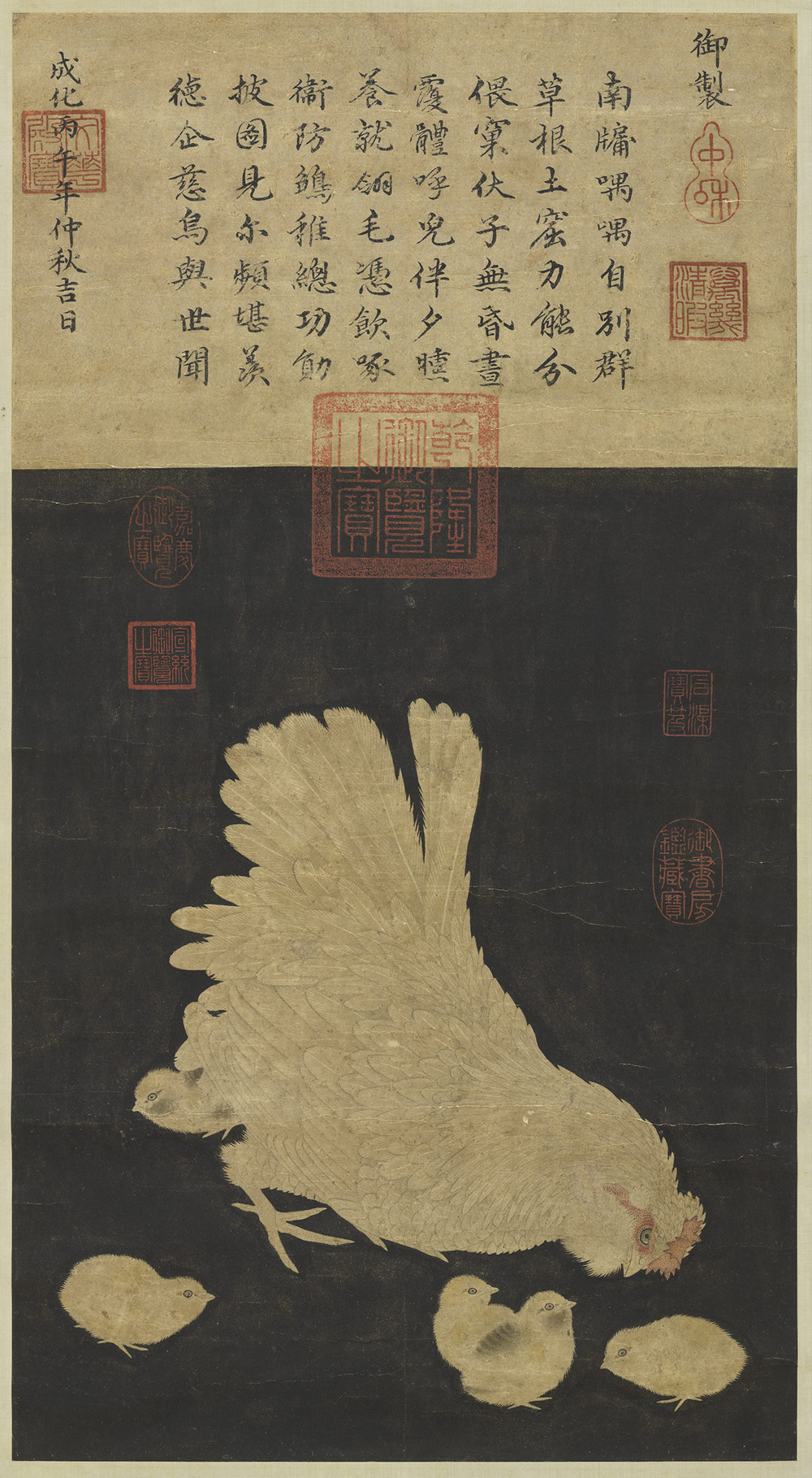 本幅画一只母鸡,引领着五只孵出不久的小鸡,在地上漫步啄食。母鸡雪白的羽毛蓬松亮丽,目光充满着慈爱,小鸡则稚嫩怯弱,依偎在母亲的羽翼保护下。由于背景全部用墨涂黑,使得主题格外突出。画中,并没有作者的签名或印记,虽然不能肯定是宋代作品,但画家对于物象的观察细腻入微,无疑是一帧写生意味浓厚的院画杰作。