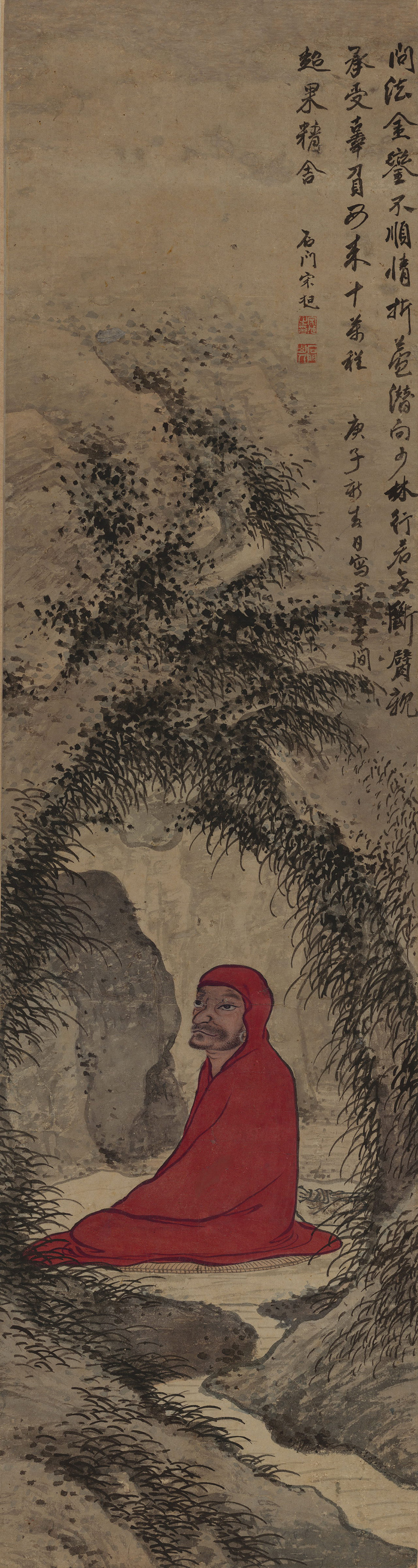 此图所绘达摩形象古朴而虔诚,四周是野草蒙茸的岩洞,达摩身着红衣,端坐于蒲团之上,正在修行。画心题“问法金銮不顺情,折盖潜向少林行。若无断臂来承受,辜负如来十万程。”署款“庚子新春写于云间超果精舍。”押“宋旭之印”、“石门山人”二印。