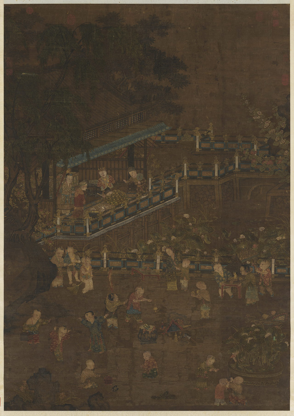端午日,树阴敞榭,曲桥池沼中荷花绽放。群婴欢戏。扮戏、舞旗、摘荷、击钹、捉蜻蜓等等,其乐融融。人物描绘生动,地面上罗列各色玩具刻划入微。庭院里胡床屏风,三位婴儿据床观赏瓶中游鱼,两位于草地上玩弄陀螺,旁有一婴孩著红衣,脸戴面具,高扬朱笔,另一婴孩,背负幼儿,循阶而下,前来相会。主要内容俱以金线勾描,显富丽装饰性。