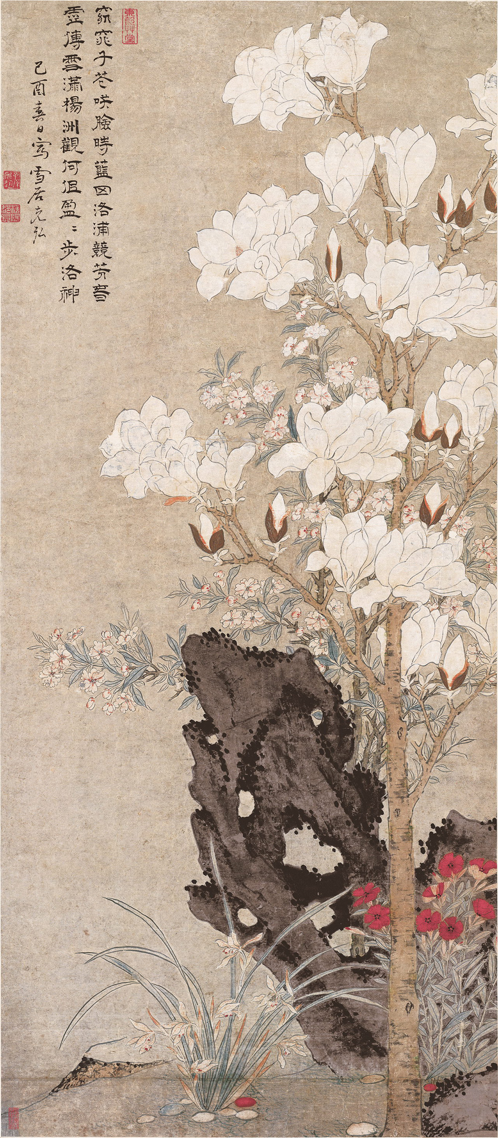 图绘拳石之旁,玉兰、兰花竞相开放。花、石的画法均极工细,玉兰花用粉多次轻染分出浓淡,再用工笔勾勒烘托出花瓣的肥厚白嫩。枝干双勾填色并施以皴擦,极富质感。山石的画法是先以淡墨勾出轮廓,然后用浓淡墨多次晕染,逐渐加深,直至显现出丰富的前后层次及石体的质感。山石玲珑剔透而刚硬,玉兰和兰花婀娜多姿而柔媚。本幅设色明丽温润,层次细腻,变化微妙,典雅端丽,属作者工笔花鸟之佳作。