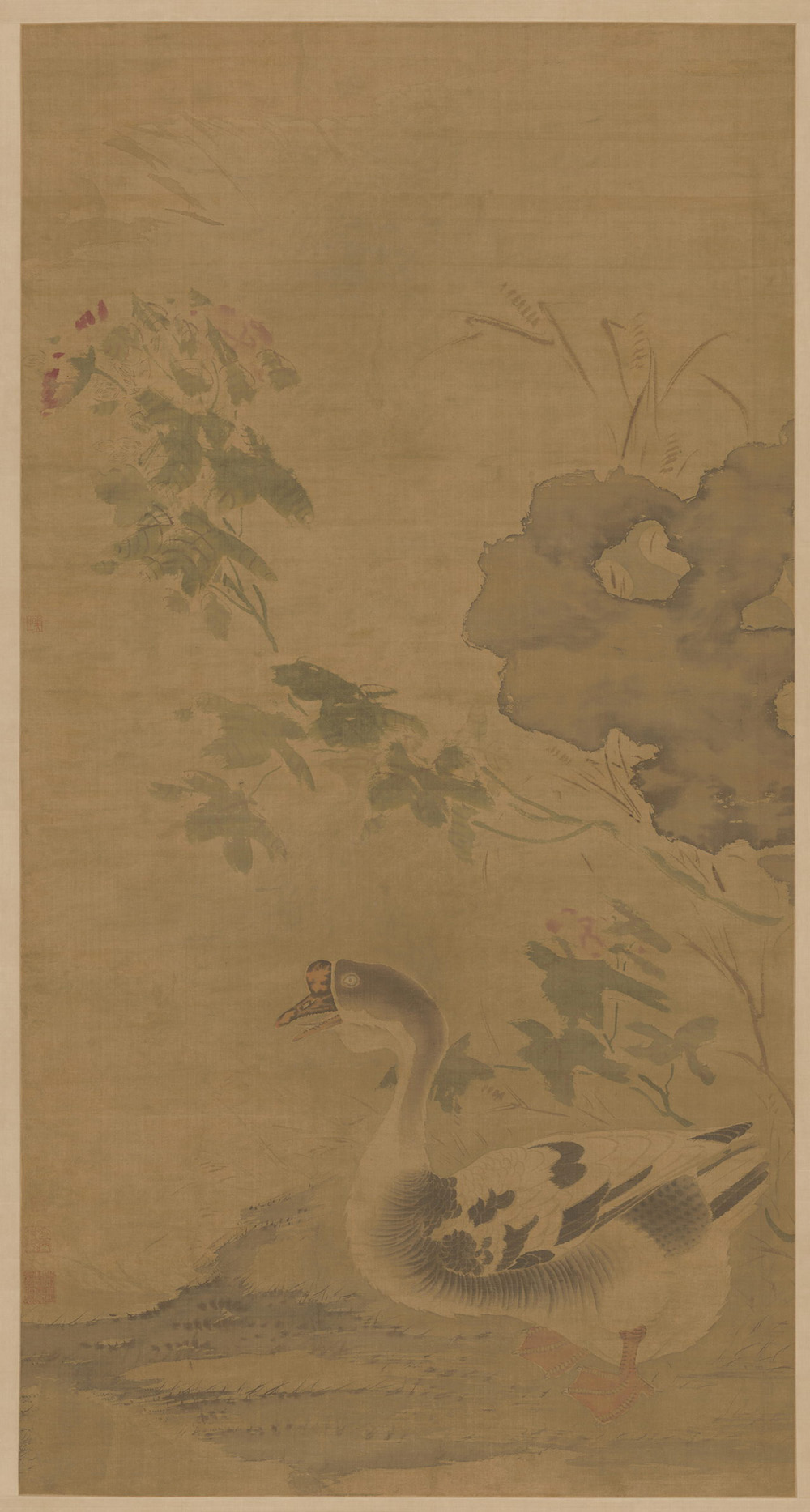 图绘池塘草畔,一只大鹅昂首前望,侧立于芙蓉、湖石下。芙蓉花叶用先点后勾法画成,墨、色相间。太湖石以没骨法渲染。鹅则兼用没骨与勾勒,以淡墨线勾勒轮廓、羽毛,淡墨渲染花色,朱棕赭石填染咀和掌,造型严整,笔致工细。整幅画不拘泥于细节的刻画,而是从整体出发,着力表现白鹅、芙蓉的生动神态。本幅无款识。钤“孫隆圖書”、“金川侍禦”、“開國忠湣侯孫”三印。