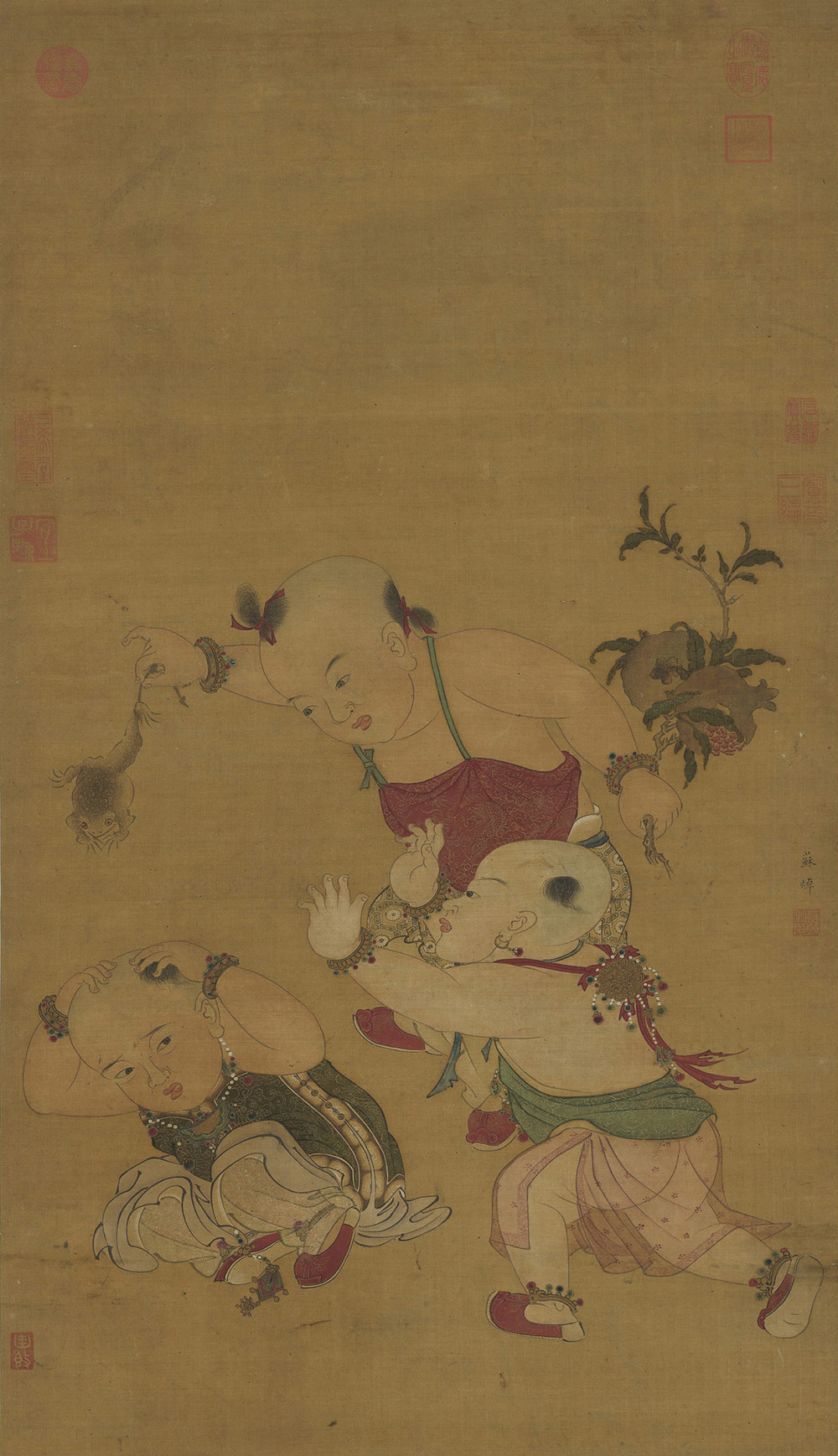 画三婴儿,一儿左手执折枝双榴,右手以绳系蟾蜍,欲置一儿头上,一儿两手捧头,蹲坐地上,状甚惊恐,一儿跃前欲夺之。三婴儿表情姿势互异,容貌圆浑可爱,笔致工稳,衣衫图案细腻,褶纹处用笔劲挺,设色淳雅。