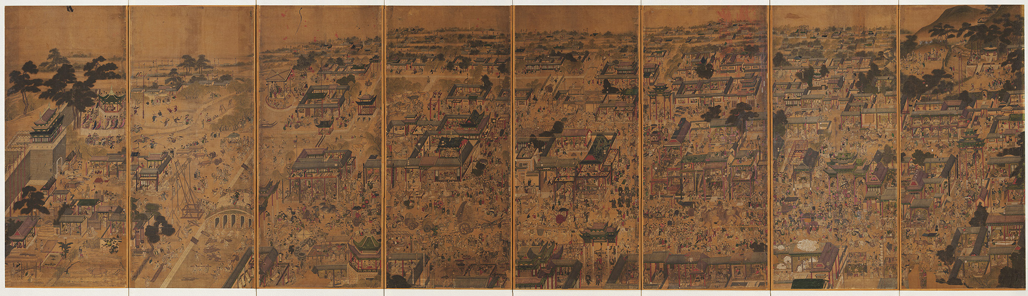 这是一部独特的作品,八幅屏风画展示了繁华城市作为商业活动、消费、文化和娱乐中心的面貌。 汇集了约 2100 个不同的人物,道路上车水马龙,繁华的店铺和金碧辉煌的建筑层出不穷。
