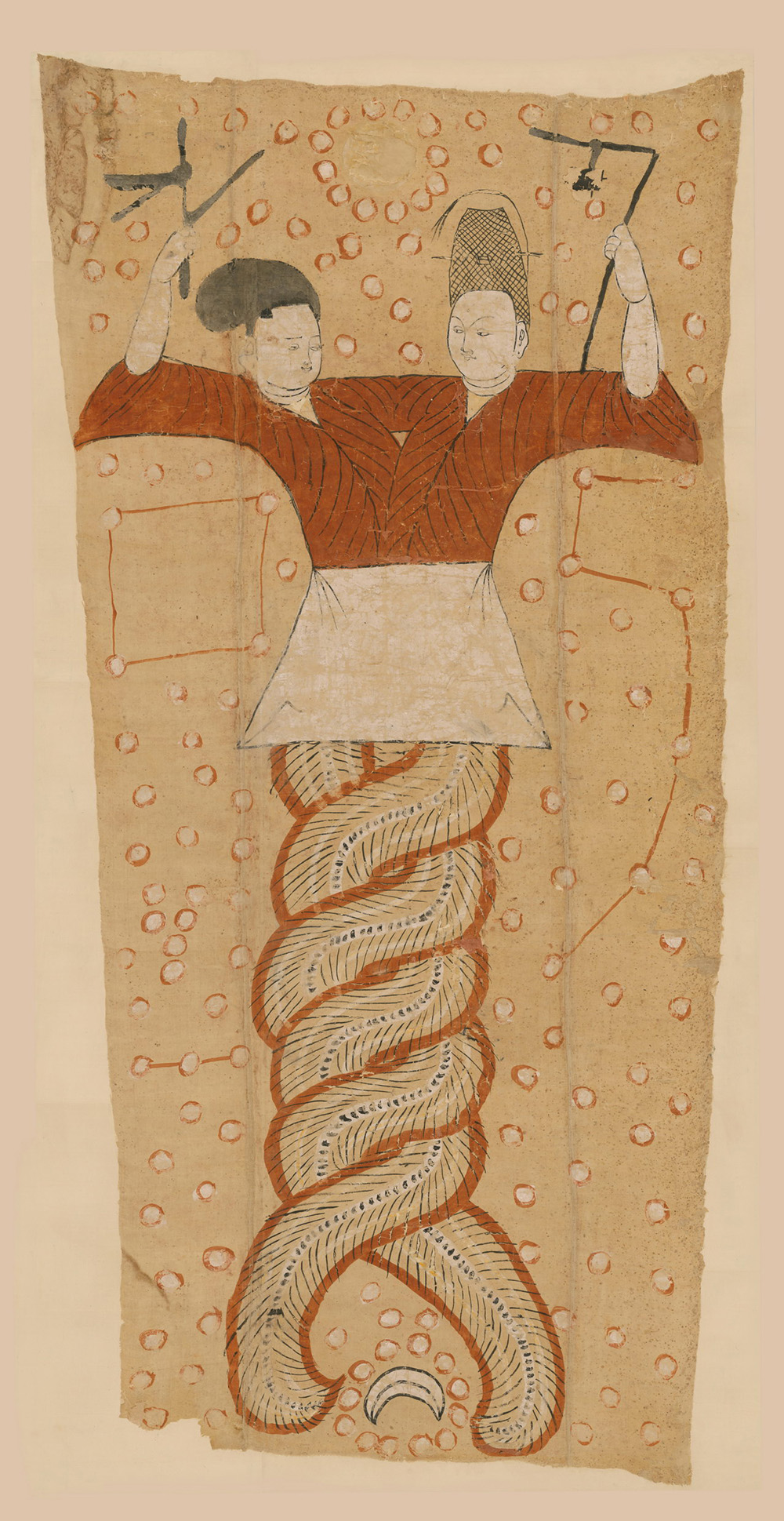 此图上彩画人首蛇身男女二人,均着窄衫小袖绛红色胡装,二人腰相连,共着一条白裙。男居左,无须,头戴笼冠,张左手执矩,矩上有墨斗(已被腐蚀)。女居在右,束高髻,张右手执规。男女上身相拥,中间两臂相连,下尾盘曲相交四节成螺旋状。两人头上有圆轮,周画圆圈以象征日;尾下有下弯月牙一,周画圆圈以象征月。画面四周面遍布大小相等的圆圈,部分以线相连象征星辰。故宫博物院所藏的伏羲女娲绢画系1963年4月出土于新疆吐鲁番阿斯塔那古墓,1963年12月由新疆博物馆拨交故宫博物院。据阿斯塔那古墓考古报告中所示,同期出土的此类绢画共有数十件。在墓室中一般都是画面朝下,用木钉钉在墓顶上。一般认为伏羲所执矩象征地,女娲所执规象征天,用以配合画面上的日月星辰,为墓室营造一个小宇宙。