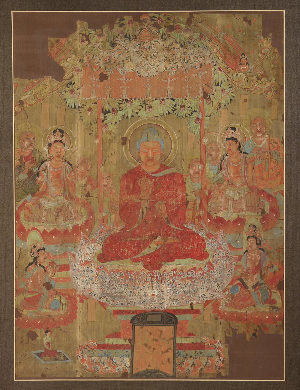 佛身穿通肩朱红袈裟,居中结踟趺坐于莲台上作说法印。左右各画一胁侍菩萨,头戴化佛宝冠,裸上身,饰以璎珞环钏,坐莲座上作听法状。菩萨身后各有三比丘,绕佛而坐。胁侍菩萨下方各画一供养菩萨,一执宝瓶,一捧莲花供养于佛。佛顶上有菩提宝盖,饰以珠缦流苏。宝盖两侧各画一飞天散花而下,右上方的一身完好无缺,左方一侧仅残存一臂及衣带衣裙。又画二飞天飞身而起,右一身残存长巾二端,左侧仅存云路。