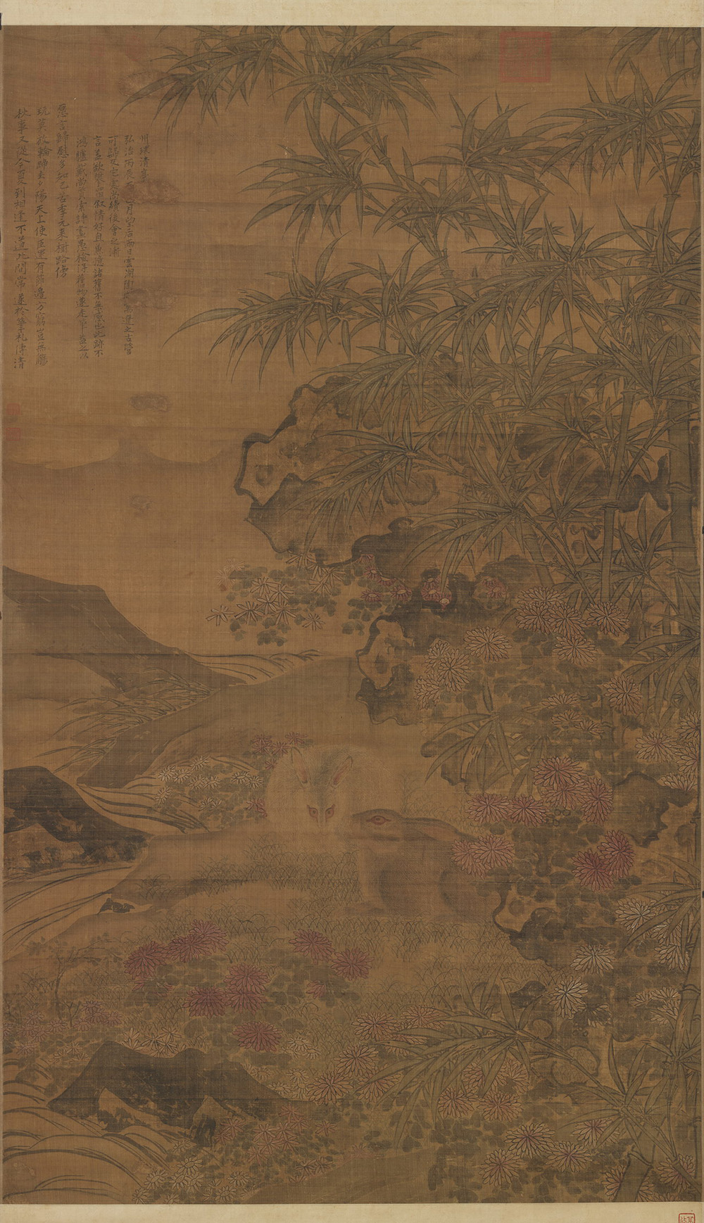 描绘山涧湍泉,竹林奇石,菊花盛开,土坡的草丛中有灰色的和白色的两只兔子蹲踞其间