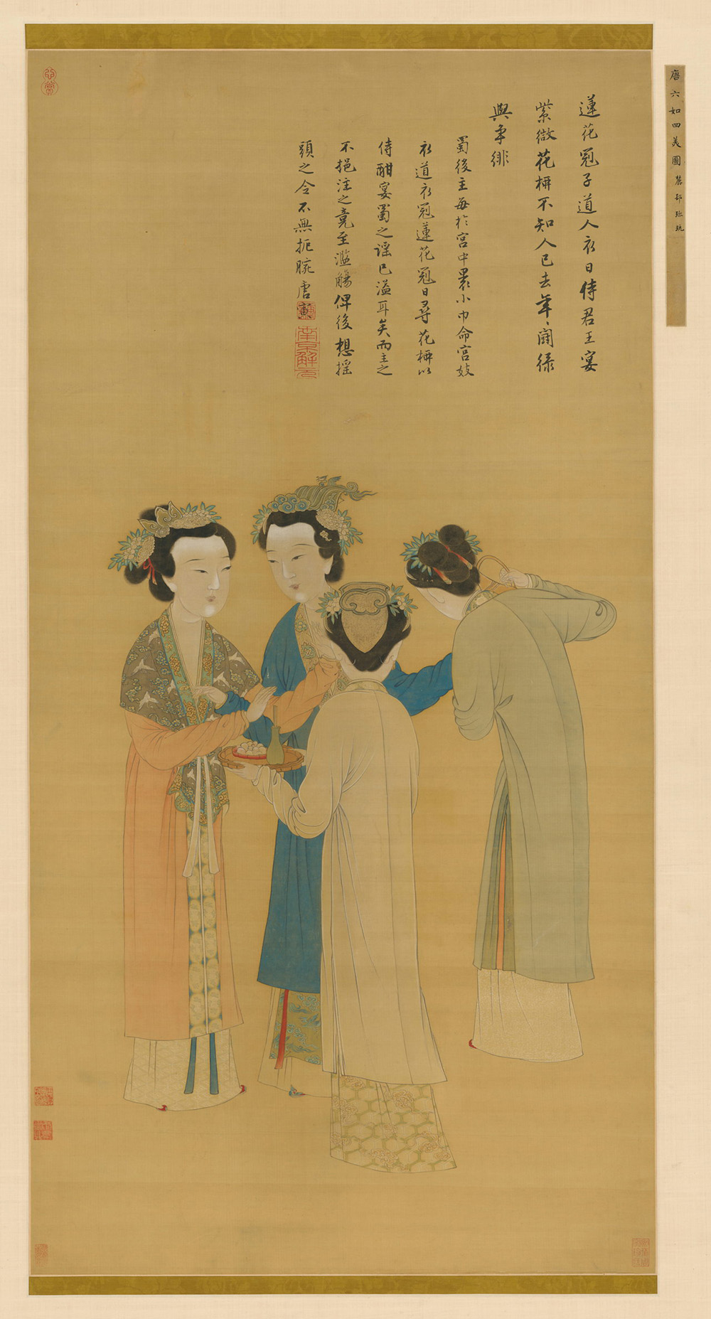本幅自题:“蓮花冠子道人衣,日侍君王宴紫微。花柳不知人已去,年年鬥绿與爭緋。蜀後主每于宮中裹小巾,命宮妓衣道衣,冠蓮花冠,日尋花柳以侍酣宴。蜀之謠已溢耳矣,而主之不挹注之,竟至濫觴。俾後想搖頭之令,不無扼腕。唐寅。”