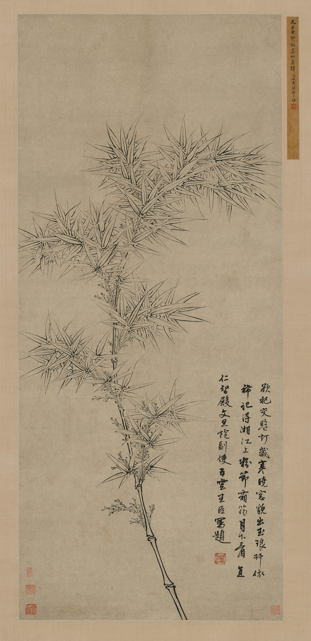 此图用白描双钩法画竹一枝,姿态潇洒。用笔圆劲精细,竹干的挺拔、节的梗脆、叶的阴阳向背都表现得十分真切,结构层次和空间处理的十分恰当,繁而不乱,疏密有致,笔笔清晰,无一笔虚设。款署:“欲把交盟订岁寒,晓窗貌出玉琅玕。依稀记得湘江上,粉节霜筠月下看。直仁智殿文思院副使五云王臣写题。”钤印不辨。
