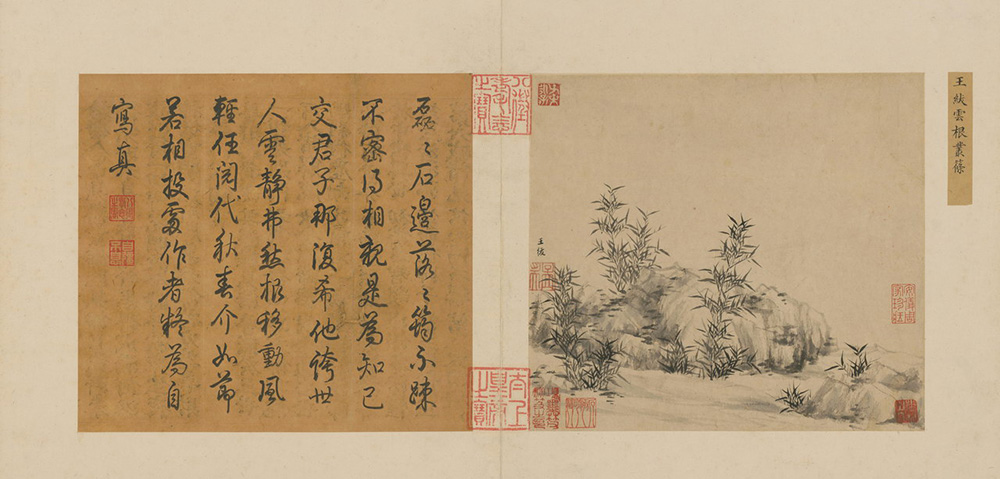 本幅墨笔画坡石丛竹,左边款:”王绂“。印”孟端“朱方,乾隆对题一页。有安岐、项子京藏印三方。