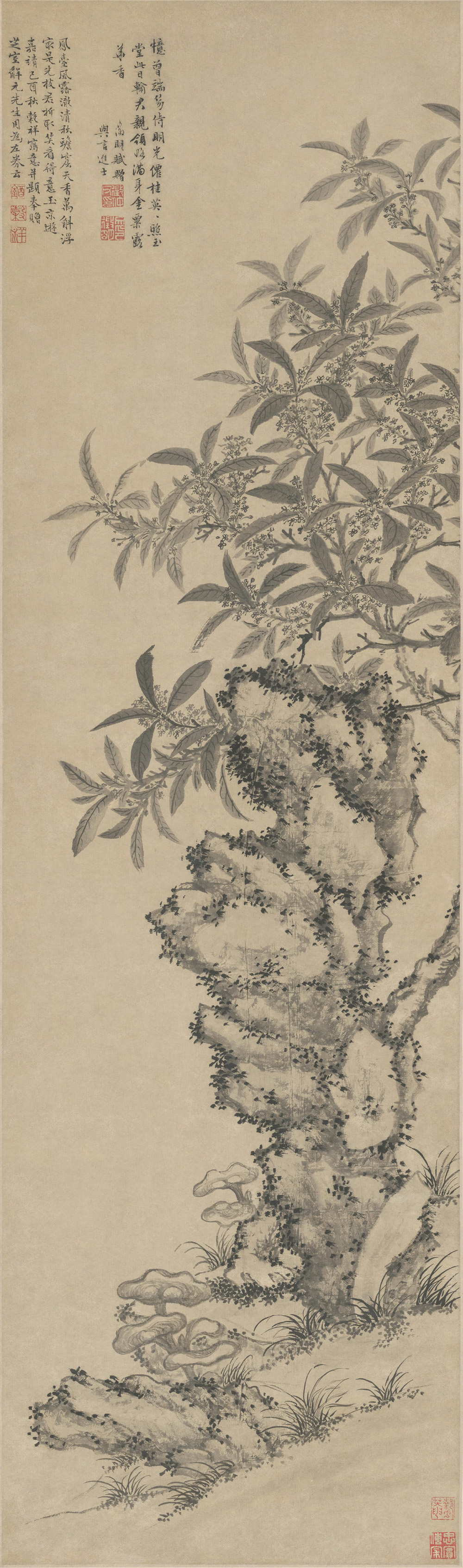 本幅自题诗一首,款署:“嘉靖己酉秋,穀祥写意并题,奉赠芝室解元先生用为左券云。”钤“酉室”朱文、“穀”“祥”朱文联珠印。另有文徵明题诗一则。鉴藏印有“蛰菴”朱文、“忠实传家”白文印两方。“己酉”为明嘉靖二十八年(1549年),作者时年49岁。此图绘灵芝几株,湖石挺立,桂花盛开。浓墨点苔,桂花树和灵芝刻画细腻,墨色渲染浓淡相间,富于变化,表现出桂花繁茂盛开的层次感。本幅笔法精谨,布局严整,明显受到了文徵明画法的影响。从本幅作者和文徵明的题诗可知,此图是为庆贺“芝室”先生秋闱(音围,指科举考试)之喜而作。当时文人图绘桂花祝贺“折桂”之人的做法很流行。本幅的巧妙之处在于作者绘的灵芝和山石正好与受画者的字号“芝室”谐音,再加之刻意描绘恣肆怒放的折枝桂花,使全幅生动地传达出“芝室折桂”的蕴意和对芝室“最是先枝君折取”的贺喜。