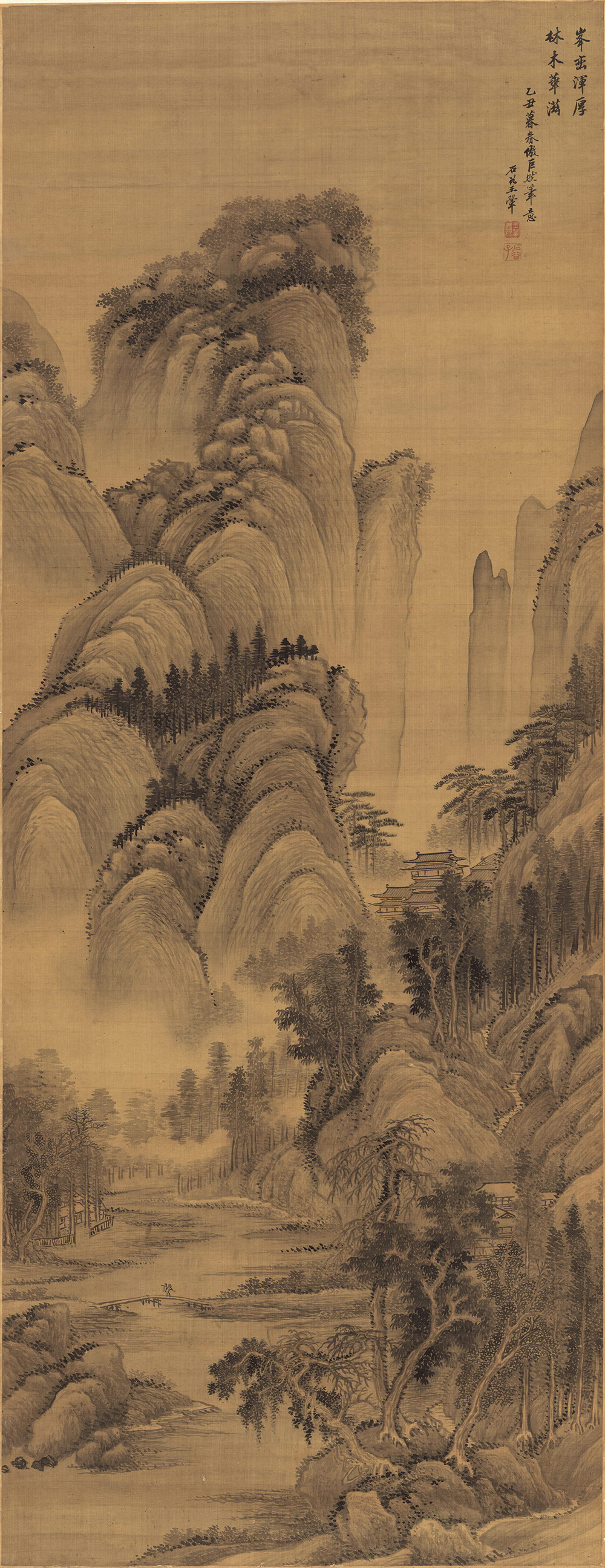款识:峰峦浑厚草木华滋乙丑暮春仿巨然笔意,石谷王翚