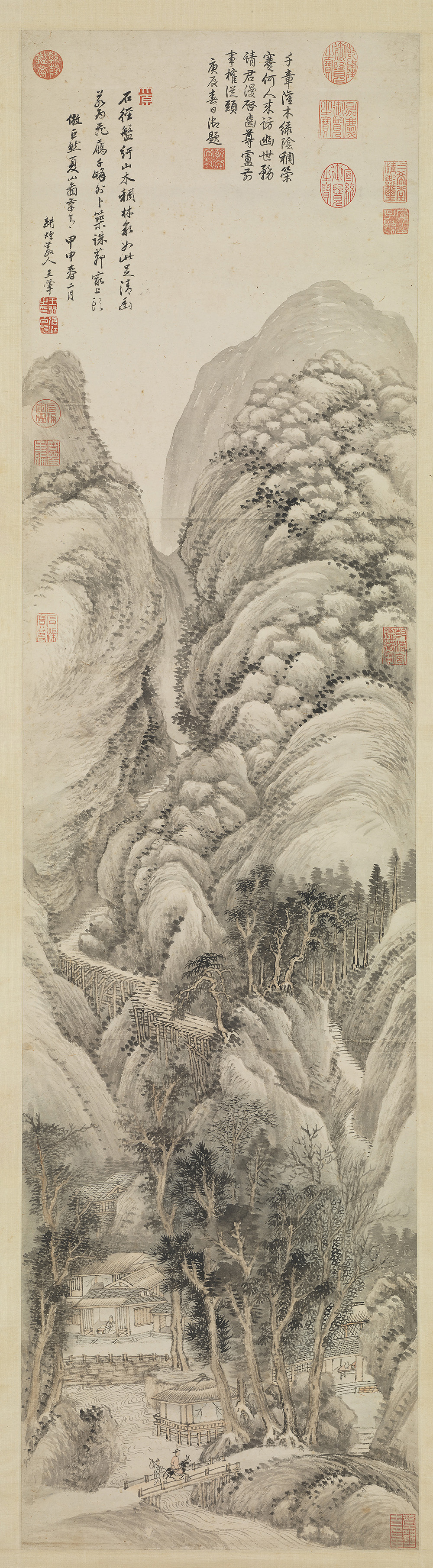 描绘高山峻岭,其下林壑幽深,水亭村屋,连缀于间。笔法能于熟? 用生,墨气极得温润婉约之韵。以浅清淡赭层层烘染,遂觉俊雅出尘,卓然超特。成于康熙甲申, 作者时年七十三岁。