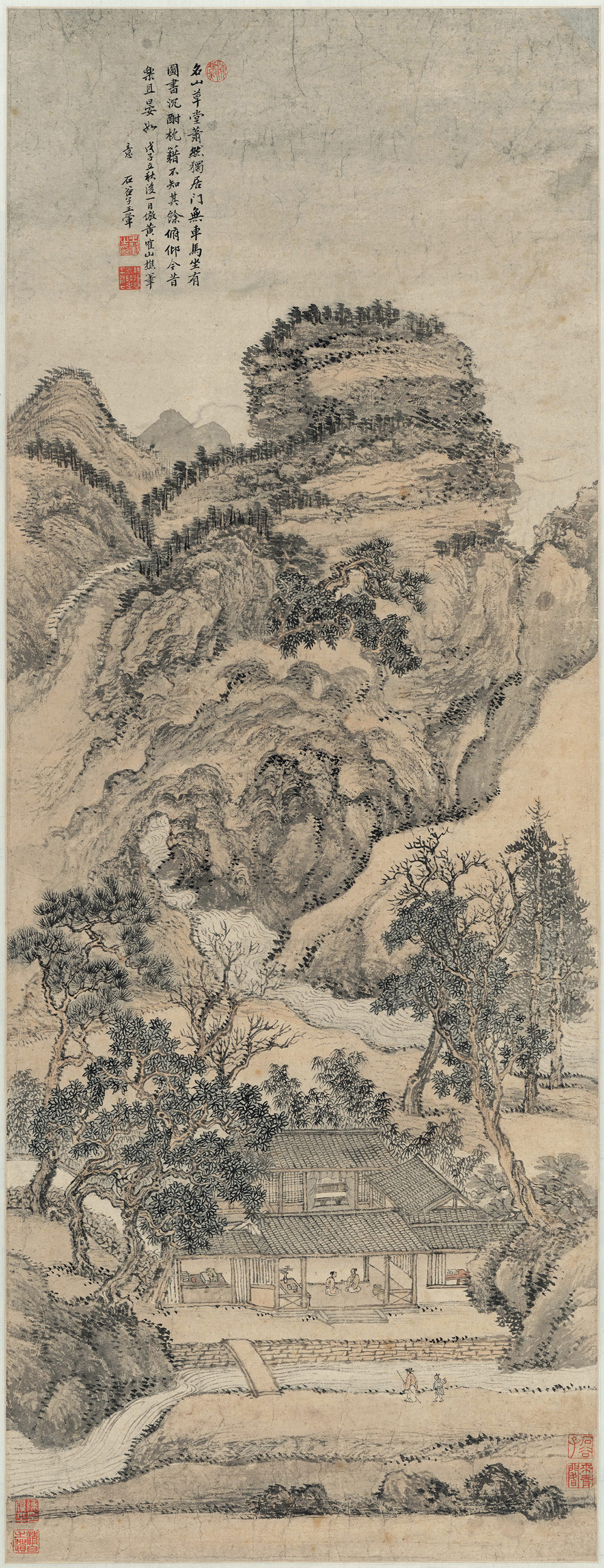 仿王蒙笔法绘山居景象,细笔勾皴与浅绛擦染交融,艺术格调既厚重又明快,构图布局清幽灵动。自题“名山草堂,萧然独居。门无车马,坐有图书。沉酣枕籍,不知其馀。俯仰今昔,乐且晏如”。款署“戊子立秋后一日仿黄鹤山樵笔意。石谷子王翚”。“戊子”为清康熙四十七年(1708),时年作者77岁,是其晚年代表作品。王翚技巧工能全面,既能作上述仿古山水,又能就眼前所见写生,格调清新,生趣盎然。