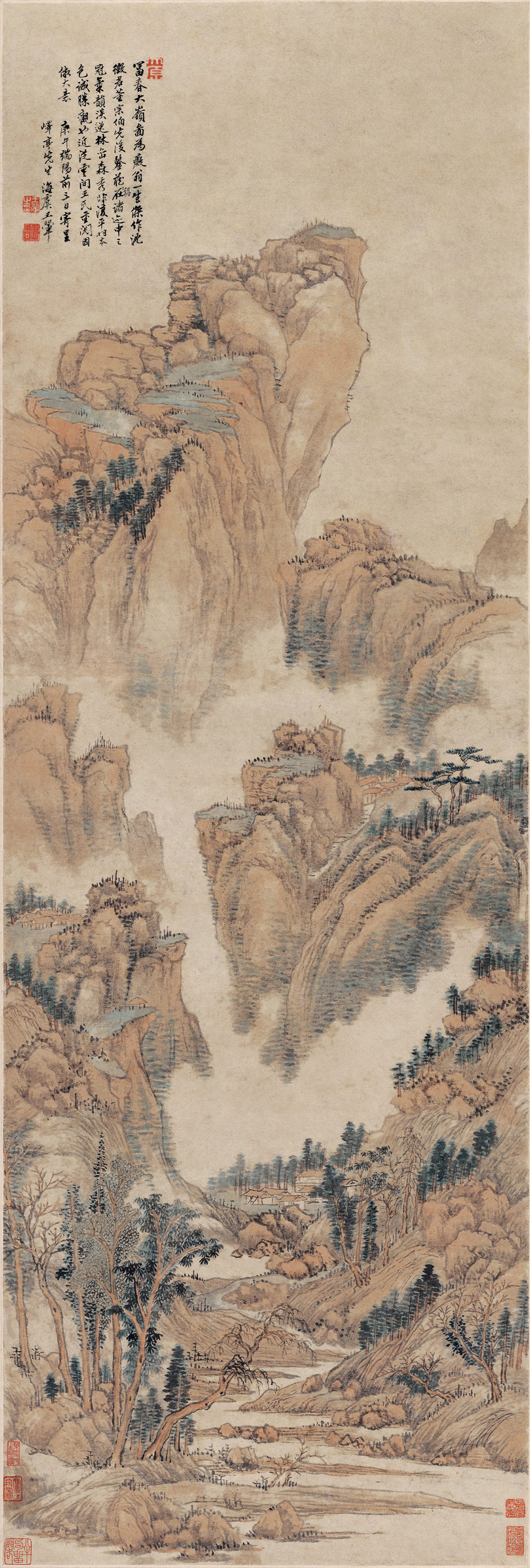 山势昂扬耸立,造形奇掘,势形鹰嘴,整体形式如同向中凝望的鹰首。这在自然界中难有存在,更像是现实与幻想的结合,或者说是作者思想的臆造。山坡,树木,山石皆好似信手拈来,运以黄公望的笔法,其炉火纯青的绘画功底已显露无疑。