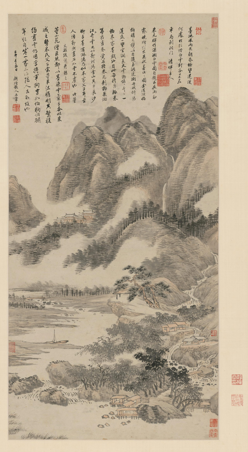 款识:墨池风雨失朝昏,极望迷漫何处村。欲借白云封谷口,不教车马到闲门。清晖主人。