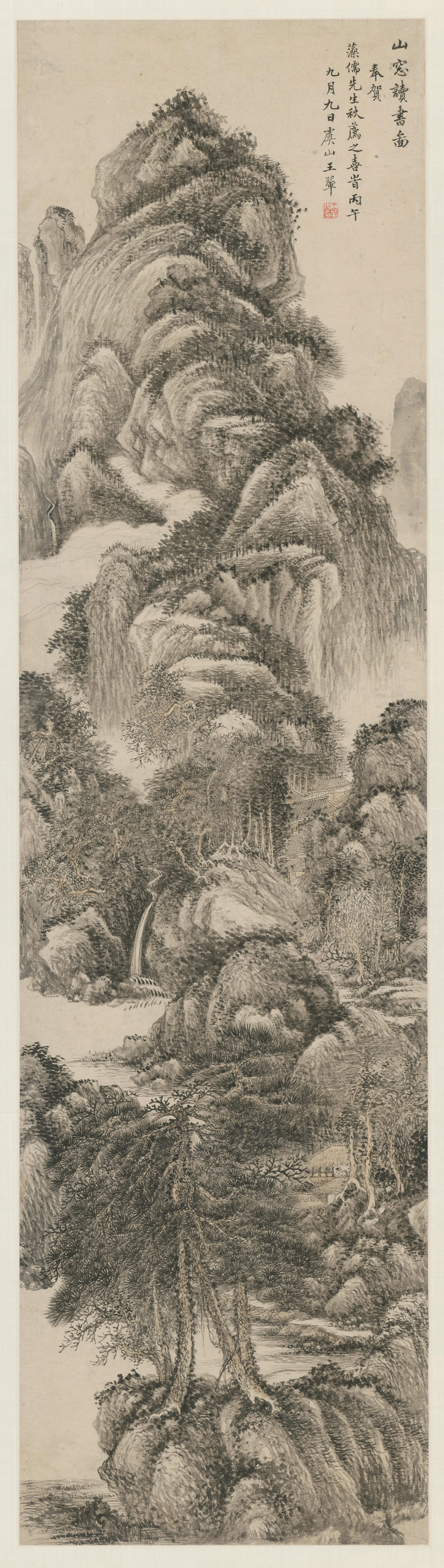款署:“山窗读书图。奉贺藻儒先生秋荐之喜,时丙午九月九日,虞山王翚。”钤“王翚之印”朱白文印。