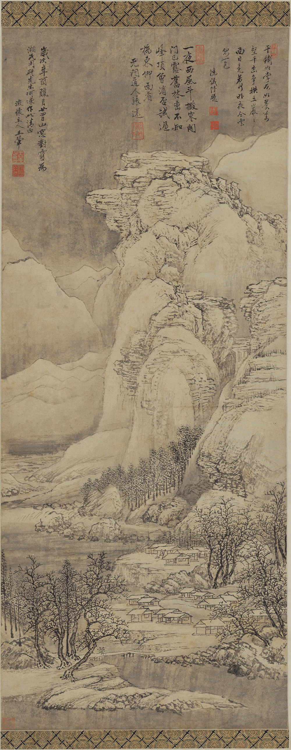 此图为仿唐寅山水,用笔轻灵,气韵生动,图中山石主要以渴笔淡墨画成,显得松秀温润,以干焦浓墨点苔,使画面更显苍润互济。着色古雅明快,色墨相映,不同凡格。款署“己未中秋前二日仿唐解0溪山晴霭图。石谷