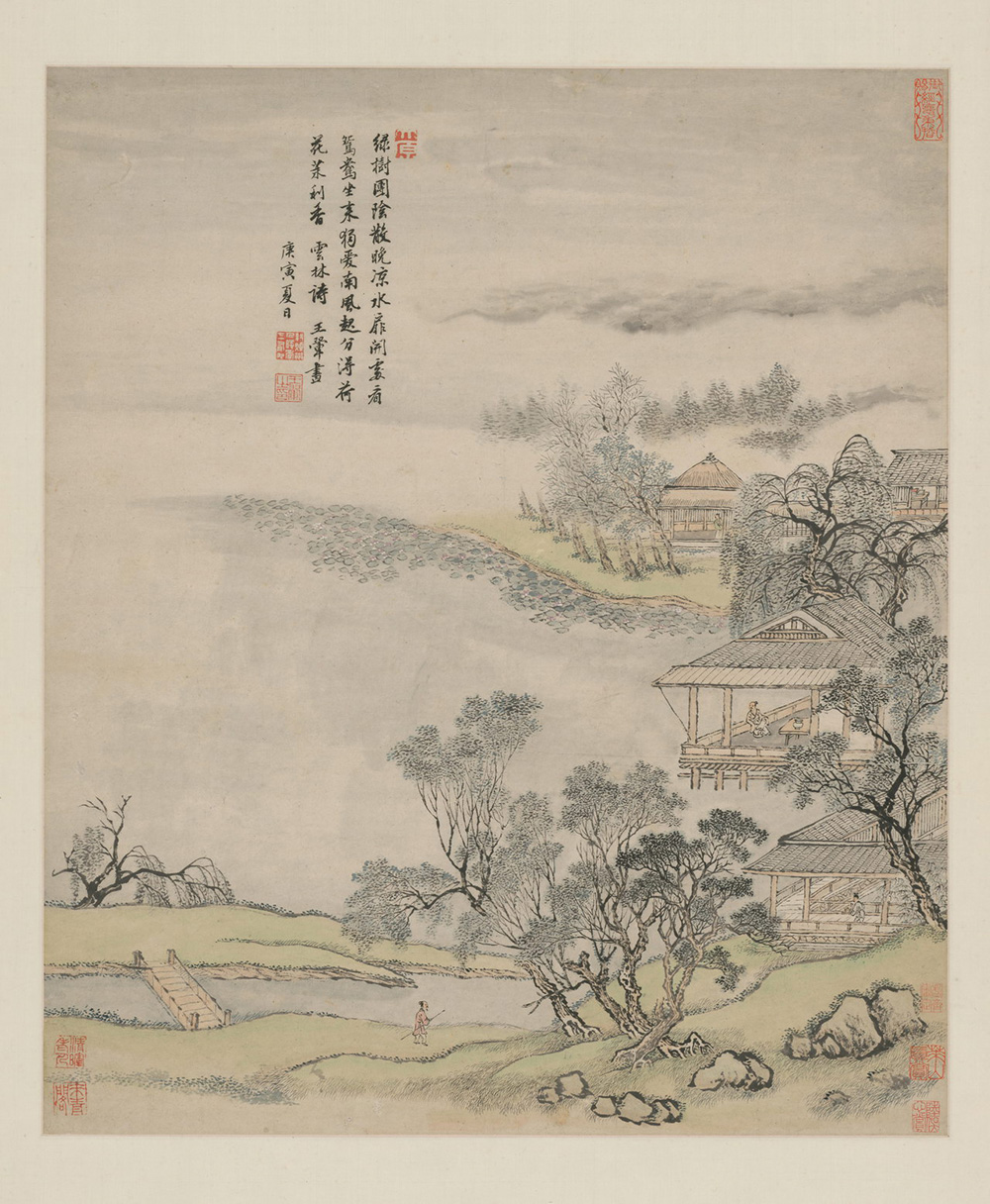 作者自题识:“绿树团阴散晚凉,水扉开处看鸳鸯。坐来独爱南风起,分得荷花茉莉香。云林诗。王翚书庚寅夏日。”